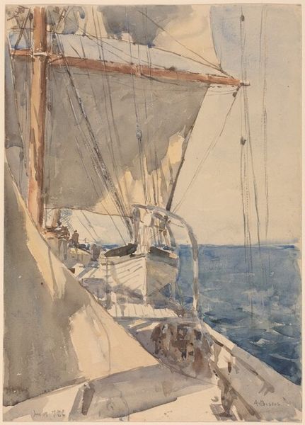 Curator: Winslow Homer’s "Key West, Hauling Anchor" created in 1903 presents a unique study of labor at sea. Rendered in watercolor, this painting depicts a group of figures aboard a sailing vessel, presumably in the act of weighing anchor. Editor: My immediate reaction is one of subdued activity and quiet strength. The cool blues and grays evoke a sense of tranquility despite the implication of demanding physical work being performed. Curator: Indeed. Homer's choice of watercolor is significant. This medium was often dismissed in his time, yet he uses it to express the working-class experience in the American landscape. Look how the composition draws you in to contemplate this social scene with undertones related to post-slavery labor in America, its dynamics and inequalities. Editor: The whiteness of the boat in contrast with the people makes me question, who exactly is "hauling" here? The symbol of the anchor itself – usually one of hope and stability – takes on a double edge when we consider who gets to experience these things and under what conditions. I can also make out small details about a distant tropical island, reinforcing themes about location, displacement, and work migration to the coast. Curator: Right, these are incredibly valuable questions. If we consider the imagery in relation to his previous depictions of Black figures after the American Civil War, we must consider how these compositions continue exploring complex themes of freedom, identity, and the social realities of the time, specifically of disenfranchised Black Americans. The symbol of a boat could be interpreted as transport to newfound opportunity or an escape for social and economic progress, although perhaps not for all. Editor: And yet, despite the potential implications of those disparities, Homer grants these people dignity through posture and position. They aren’t mere objects, or tropes; they seem ennobled. There is an echo here too of ancient iconography—labor on the water being connected to journeys and potential riches to come, either material or spiritual. Curator: Agreed. Homer invites us to reflect on how our histories intersect, revealing not just individual experiences, but the collective, interconnected realities that shape societies. Editor: Absolutely. Looking closer, I appreciate Homer's sophisticated use of cultural symbolism and imagery as commentary on the dignity, challenges, and nuances of their historical circumstances.