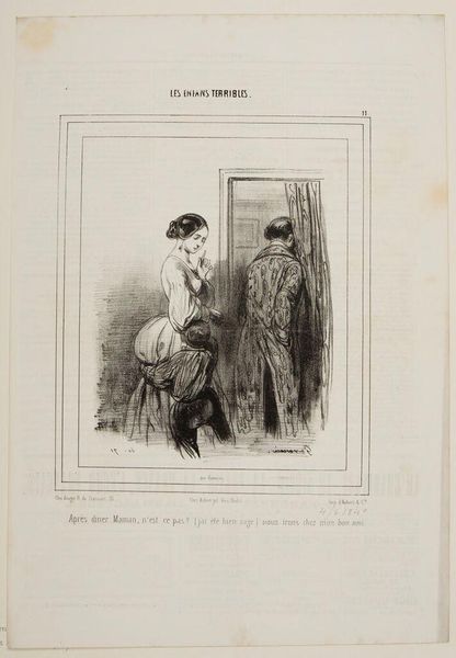 Editor: This is Paul Gavarni's "Wednesday he paints his passion." I'm struck by the intimacy of the scene, yet there's also a melancholic air. What do you make of this interaction? Curator: I think you've nailed it. Gavarni captures a poignant moment – is it a plea, a farewell? Perhaps the man is confessing his undying love! I see the artist exploring the tension between public performance and private emotion. The woman's gesture seems aloof, distant. Does she return his gaze, or his affection? Editor: That's a great point. I hadn't considered the performative aspect so much. Curator: These glimpses into the world are gifts, aren't they? We get to imagine the rest of the story, what was, what could be, what will never be.