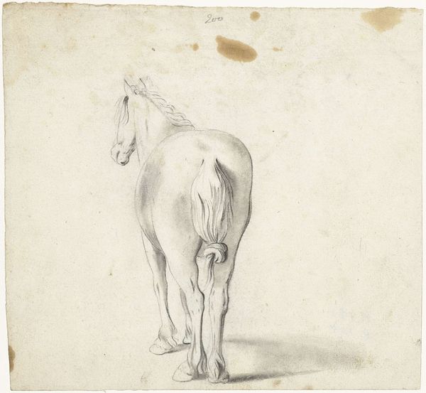 Curator: Looking at this pencil sketch, "Studies van een paard," dating from between 1855 and 1912, by Jan Kuyper, my first impression is one of arrested motion—it feels unfinished yet captures so much. Editor: Unfinished, yes, and precisely because of that, it captures potential. What draws me is the line work. The lightness of touch, the way Kuyper uses varying pressure to define form… there’s an elegance. What else do you see, formally speaking? Curator: It feels intentionally sparse. Given Kuyper's era, it's interesting to consider how this rendering relates to the changing role of the horse, not merely as a beast of burden, but increasingly symbolic of status and freedom. Editor: Absolutely, the realism is undeniable. But look closely: the anatomical studies almost resemble an architectural plan; a structure in lines, shadows defining shape and balance. It pushes beyond mere representation. There is also a philosophical undertone; each sketch explores distinct possibilities in its manifestation. Curator: Right. This could also engage conversations around labor, class and gender roles in Dutch society, specifically looking at how different demographics interacted with the animal—an upper class and the role of horses, farms that require them. And then it starts being this image that can spark further discussion. Editor: It also brings to mind the tradition of equine art throughout history— from antiquity to Stubbs. The rendering feels almost classical. By distilling it to line and form, stripping down ornament, perhaps that's the heart of its appeal? Curator: Seeing it now—through both our lenses—I feel an expanded understanding of Jan Kuyper's sketch, one that honors form and celebrates social history and human experiences reflected through the humble horse. Editor: Indeed! Analyzing it in layers like that brings new insight. It truly shows the artwork, no matter how simple in its form, holds multitudes.