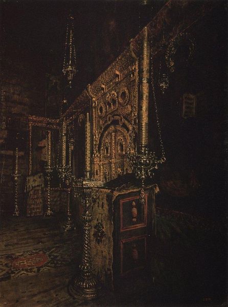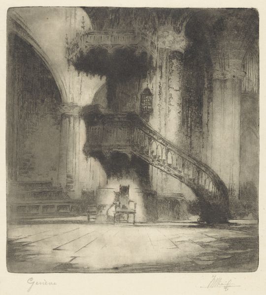 Curator: This is John Piper's "Chambord Rooftops," held here at the Tate. It captures the elaborate architectural details of the Château de Chambord. Editor: It's really quite dark, almost oppressive. The texture looks rough, with heavy inks, making the castle feel less like a monument to royalty and more like a haunted stage set. Curator: Interesting observation. Piper’s work often explores the collision between romanticism and ruin, reflecting on the historical narratives embedded within such grand structures and how they are implicated in systems of power. Editor: Thinking about the materials, the ink and the paper itself, it seems like a deliberate choice to depict these opulent structures with such rough, almost industrial means. Curator: Absolutely. It invites us to consider how the means of representation affect our understanding of history and wealth. Editor: It makes one consider the weight of the past, the physical labor that built it, and the paper it's printed on. Curator: It's a reminder that even the grandest structures are products of human labor and socio-political dynamics. Editor: Indeed, the materiality reveals histories beyond the romantic facade.