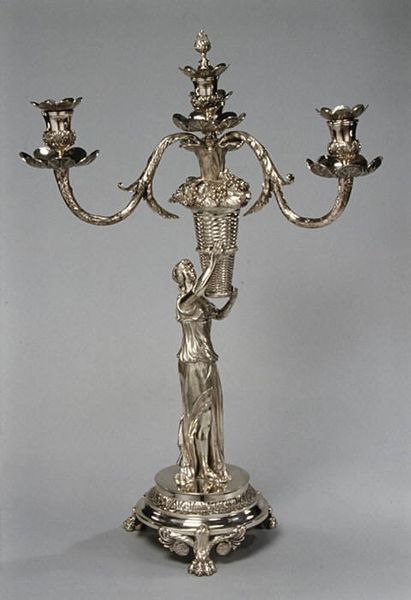 This is a silver candelabra made by Georg Jensen, a Danish silversmith renowned for his contributions to Art Nouveau and Arts and Crafts movements. Jensen, who lived through a period of significant social change, created works that reflected the aesthetic values and cultural shifts of his time. The candelabra embodies a blend of opulence and handcrafted quality, speaking to the era's complex relationship with industrialization and artistic expression. Jensen was an advocate for artistic integrity, and said that a design should "live and be beautiful and vital in the hands of the user." The candelabra's function as a light source is also significant. Before the widespread availability of electric lighting, candlelight played a central role in daily life, infusing social gatherings with a sense of warmth and intimacy. As such, this object reflects the socio-cultural history of its time.