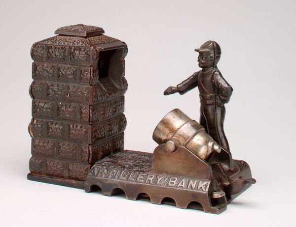 Peter Adams' "Artillery Bank" is a cast iron mechanical bank of unknown date, embodying early American industrial ingenuity and the era's complex relationship with militarism. These coin banks, often marketed to children, were more than mere toys; they instilled values of saving while subtly normalizing military power. The soldier standing proudly beside the cannon highlights the romanticized vision of military service, a narrative carefully crafted and perpetuated in popular culture. In a time when war and conflict shaped global politics, such objects encouraged a sense of national pride, but also a certain detachment from the realities of warfare. Consider how this object, designed to hold wealth, is intertwined with images of military might, revealing connections between economic prosperity and the projection of power. It prompts us to consider what values and narratives we embed in the objects we create and cherish.