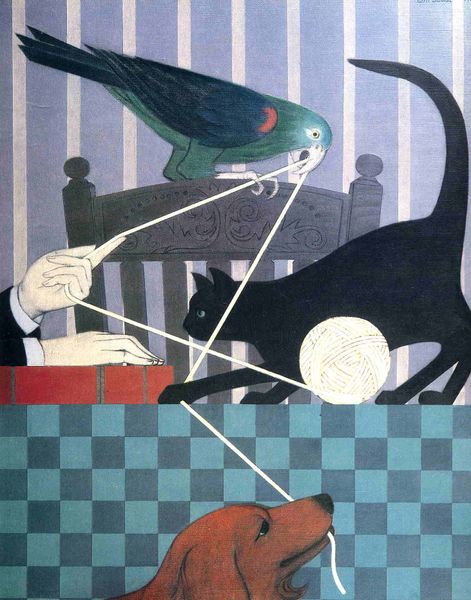 Curator: Will Barnet's "The Mirror," completed in 1981 using oil paint, presents us with a fascinating interplay between the intimate and the reflective. Editor: My first thought? Melancholy. The cool blues and grays, the woman's downward gaze—it’s all incredibly muted, quiet, almost sorrowful. The shape feels geometric and intimate like she's confined in the canvas. Curator: Absolutely. Barnet was a master of distilling emotion through simplified forms. Consider the composition; the woman's figure is echoed in the mirror, but with a distinct difference in the external view she gazes toward versus her own contained state, inviting us to reflect on identity. Editor: And there's a visual dichotomy set by the use of horizontal lines, the window to the left seems cold and static. The cold is mirrored in the color selection for the entire piece. How do you see his work fitting into the broader history of portraiture and figuration? Curator: Barnet had a very personal sense for both traditions. He was drawn to formalism like Picasso and also surrealism to add abstract thoughts to common spaces. His goal wasn't to copy figures, it was to capture a shared emotive state. I see the strong influence of Intimism here with his intimate portraits. The modern and intimate blend seamlessly. Editor: The tree! Bare branches visible through the window in the mirror serve as a sharp detail with such sharp contrasts to the cold space that exists between her body and her reflection, it highlights time's unforgiving gaze on a face staring in the mirror. The window feels almost more vibrant compared to everything else as if hinting that there's more than being introspective, as opposed to being present. Curator: Indeed, it's an invitation to contemplate the layers of self and perception. Editor: What's so moving to me is how "The Mirror" evokes such a stillness while probing complex questions about interiority and reality. Curator: For me, it reveals our constant conversation of introspection, which isn't meant to be somber but instead revealing of who we are when it's just us, as human beings.