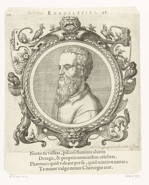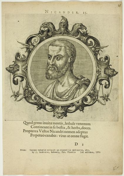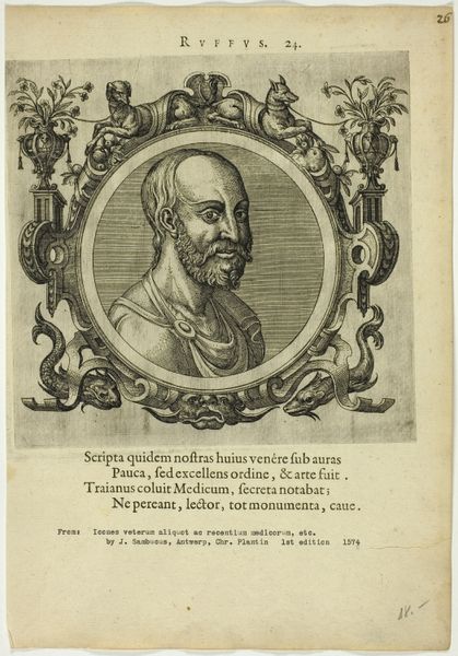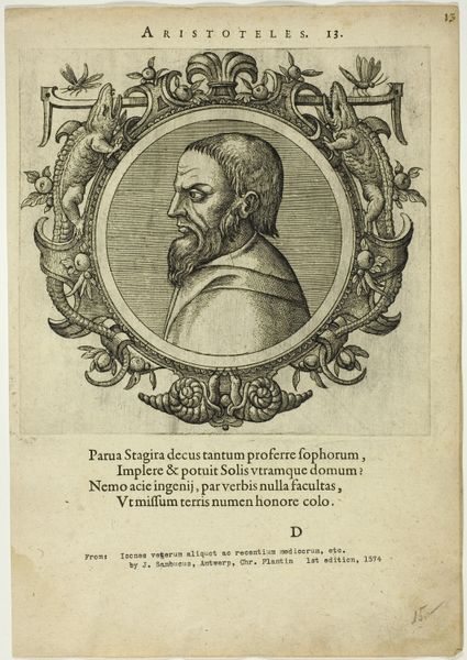 This print of Theophrastus was made by Pieter van der Borcht around the turn of the 17th century. It’s an engraving, a process that involves incising lines into a metal plate, applying ink, and then pressing paper onto the plate to transfer the image. The image is made up of precise, deliberate lines that define the contours of Theophrastus's face and the surrounding decorative elements. Note the contrast between the solid areas and the fine, cross-hatched shading – this creates depth and volume. Engraving was a highly skilled and labor-intensive process, demanding specialized knowledge and tools. This reproductive technique allowed for the relatively inexpensive dissemination of images. In a world before photography, prints such as this one played a crucial role in circulating knowledge and artistic ideas. The very act of producing this portrait, and others like it, underscores how knowledge itself was being industrialized and disseminated at the time.
