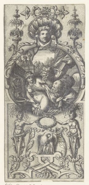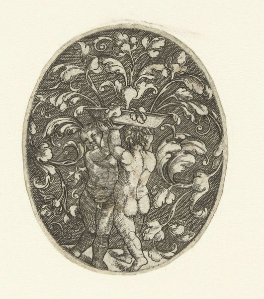 Curator: Welcome. Here we have a print titled "Vlakdecoratie: Hercules vangt het Erymantische everzwijn" or "Flat Decoration: Hercules Catches the Erymanthian Boar." This engraving was created sometime between 1519 and 1591 by Gerard de Jode. Editor: It feels both chaotic and carefully ordered. The high contrast etching certainly emphasizes the violence of the scene, while the oval composition gives it an oddly decorative feel. Curator: Exactly. De Jode's skilled use of line is remarkable. Notice how he varies the line weight to create depth and shadow, particularly on Hercules' musculature and the boar's bristling hair. The composition is quite complex, yet balanced. Editor: How do you see the labor involved, the act of producing this image at the time? Considering it was intended as a "flat decoration," there seems to be tension between artistic mastery and functional craft. It highlights how printmaking disseminated classical myths. Curator: That's a keen observation. The act of engraving, meticulously transferring an image onto a metal plate for reproduction, speaks to a burgeoning culture of mass production and distribution of visual narratives. Editor: There's something powerful about seeing Hercules rendered through this process. It domesticates this violent story, framing the classical ideal of heroism within a more quotidian, accessible format. What’s the scale of this? Is it intended for books? Curator: Its size suggests it might be a model, indeed, for some bigger art piece: books, or maybe even for bigger artworks such as furniture or wall decoration. Ultimately it shows how even mass media from the Renaissance can allude to timeless forms and tell very old stories. Editor: A blend of artistry, labor, and narrative dissemination—a testament to the layered meanings embedded in the art making of that era. Thank you. Curator: And thank you. The structure and texture truly offer so much for understanding 16th-century ideas.