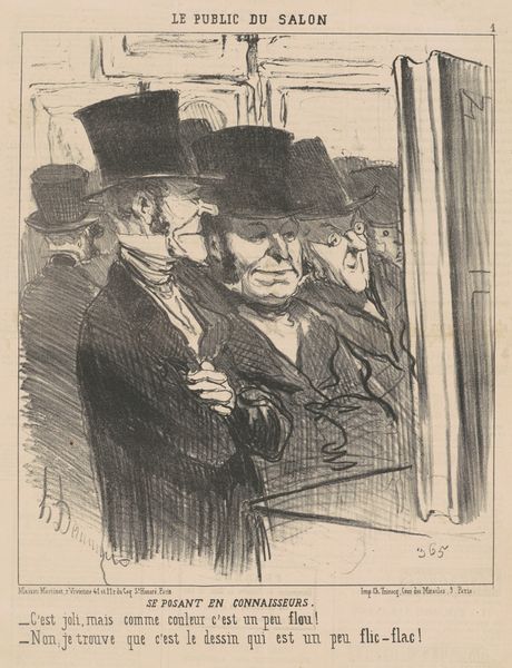 Curator: Editor: Here we have Honoré Daumier's "Quand sonnent quatre heures," a lithograph print from the 19th century. It seems to depict a rather chaotic scene, almost like a scrum, with people and their belongings entangled. What's your take on it? Curator: What strikes me immediately is the explicit connection between this artistic output, the lithograph, and the rapidly changing social landscape of 19th century Paris. The mass production of prints was transforming how people engaged with art and information. But what labour, tools, and material production are embedded in this specific work? Editor: Well, I see it was mass-produced using lithography. But looking closer at the subject matter, it seems to mock the bourgeoisie? Is it making fun of their behaviour or their possessions, like the canes and umbrellas? Curator: Precisely. Daumier, through this medium accessible to a wider public, uses caricature to critique social behaviours, perhaps satirizing the materialism and even the inherent class conflict bubbling beneath the surface. Think about it: what commentary is Daumier making about the nature of crowds, consumerism, and perhaps, even the absurdity of artistic consumption itself, when artwork appreciation is more like a 'struggle' of elites to mark territories by cane? Editor: That makes a lot of sense. So it's not just about *what* is depicted, but *how* it's depicted and distributed that gives it its power. A painting on display would have never made such an immediate and poignant effect on a large social spectrum. Curator: Absolutely. The print’s existence as a commodity, made via industrial means to capture a bourgeois audience *en masse,* ironically reflects and critiques the very system it’s part of, the print is an argument embedded in itself. Where is beauty when all are struggling to retrieve their umbrellas at 4pm? Editor: I never considered the tension between the medium and the message. This has really opened my eyes to a new way of seeing art!