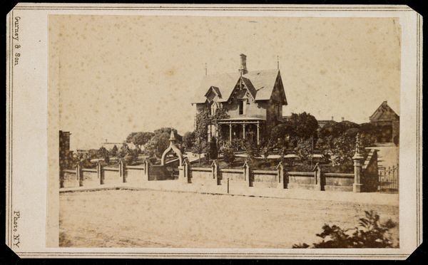 Editor: This is a photograph titled "Villa in Baarn met brug" – or "Villa in Baarn with bridge" – created by Hendrik Herman van den Berg in 1896. It has a lovely, nostalgic feeling, almost dreamlike. The composition seems carefully balanced with the bridge leading our eye to the villa. What visual symbols jump out to you in this image? Curator: The bridge itself, of course, isn't just a practical structure. It acts as a symbolic link – connecting not just physical spaces, but also ideas of transition and connection between the past and present. How might the bridge’s ornamentation reflect Victorian values about public infrastructure, considering its date of 1896? Editor: It seems like it's making a statement about progress and access. Do you think the style or technique used adds meaning to the scene? Curator: Definitely. The sepia tone lends it that sense of history, of a world slightly removed. It’s important to think about what "home" signified at this time and how van den Berg is trying to capture it with the Villa and bridge as visual emblems. Perhaps think of them together as part of an idealized life and status. Editor: So the sepia tones, the villa, and the ornamented bridge are telling a more complete story about society and culture? Curator: Precisely. They echo the social and emotional value placed on stability, progress, and home life at the time. It makes you wonder about the story of the people who lived in that Villa. Editor: That's a perspective I hadn't considered before. I was so focused on the aesthetic, I didn’t think about how it reflects society’s values. Curator: Sometimes the most powerful symbols are the ones we see every day, like bridges and homes. Understanding their context unlocks their meaning.