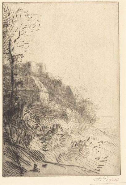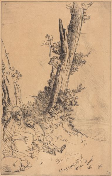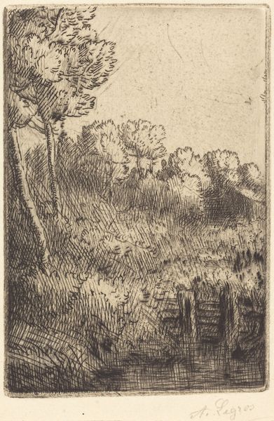 Alphonse Legros created this print, Edge of a Brook, using etching. Note the density of the etched lines, creating areas of deep shadow and texture that pull us into the scene. The composition is dominated by a large tree trunk, its massiveness emphasized by the intricate network of lines defining its bark. This creates a powerful vertical thrust. The surrounding foliage, rendered with looser, more gestural lines, seems to vibrate with life. The brook at the bottom is suggested by simple horizontal strokes. Legros masterfully exploits the tonal range achievable through etching. The overall effect is one of quiet contemplation, inviting us to reflect on our relationship with nature. This natural scene is not just an aesthetic object but an open field for interpretation, revealing how we perceive nature through the formal qualities of line, texture, and composition.