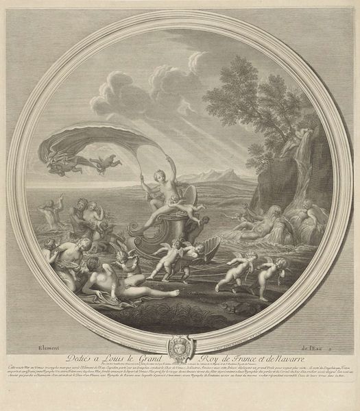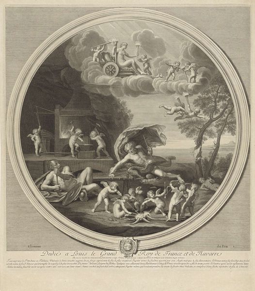 Editor: This print, "Fire," by Etienne Baudet, looks like a chaotic scene from mythology. What strikes me is the contrast between the industrious figures near the forge and the playful cupids. How do you interpret this composition? Curator: It's fascinating to view this as an allegorical representation of power. Consider that this print is dedicated to Louis XIV, "the Sun King." Editor: I see! So the industriousness and chaos might reflect the ambition and energy of his reign? Curator: Precisely. The cupids, often associated with desire, might symbolize the king's influence and the desires directed towards him. How does understanding the dedication change your view? Editor: It adds a layer of political commentary. It makes me think about the role of art in promoting the image of powerful rulers. Thank you. Curator: Indeed. Art like this served a crucial function in shaping public perception and reinforcing authority.