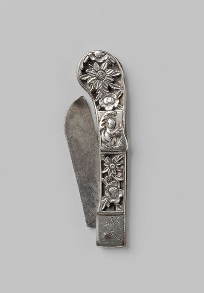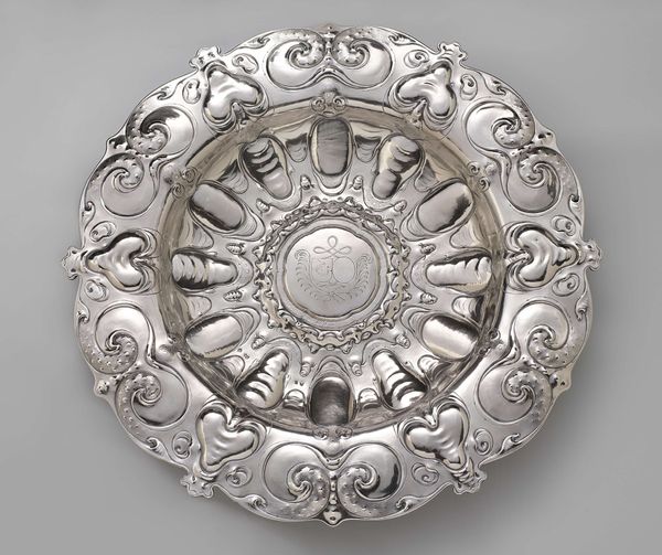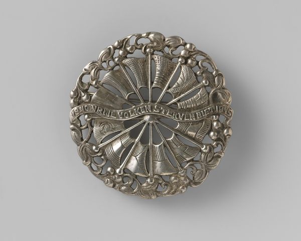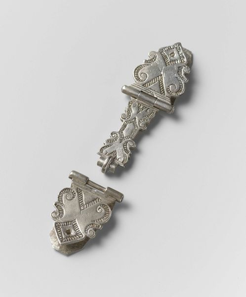 Editor: Here we have Toussaint Brunel's "Gesp van zilver," a silver buckle crafted in 1783. It's remarkably detailed, and there's something about the floral ornamentation that gives it an unexpectedly romantic air. What can you tell me about the significance of such a decorative piece? Curator: Indeed, its romance isn't accidental. The floral motifs resonate deeply. Consider the rose, a timeless emblem of love and beauty, and the leaves and vines that speak to growth and continuity. Beyond mere adornment, objects like these carry cultural memory, encoding societal values within their very form. What feelings or occasions do you imagine this buckle connected to? Editor: Perhaps weddings, or celebrations of some kind? I see how the floral design elements work well to express those ideas of beauty and growth in love. Curator: Precisely! Now think about where it might have been worn. Not just any strap, but something perhaps deliberately visible, declaring status but also signalling attachment. The heart has long been associated with these floral motifs... could this ornate design communicate both beauty *and* commitment? Consider how these symbolic associations evolve over time – their emotional power shifts and reshapes with cultural change. Editor: I never thought about it in that way before. The image seems simpler now but has multiple meanings through the symbolism, especially in relationship to the floral details and where it might be worn. Curator: Visual symbols are a powerful language and can hold meanings that people then and now understand as representing a new beginning and promise. This object reminds us that material culture carries embedded within it the very spirit of its age. Editor: I'm so much more aware now of the many layered meanings in the visual iconography. Curator: Exactly! Now, just imagine the stories it could tell about its previous owners and the continuity of traditions through generations.