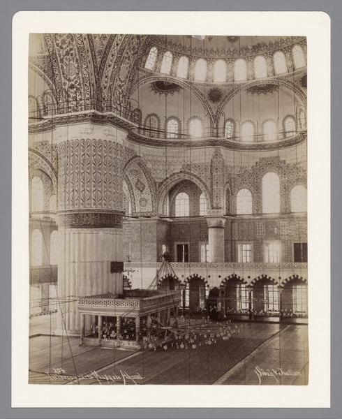 This albumen print by Sébah & Joaillier captures the interior of the Sultan Ahmet Mosque in Istanbul. Produced during a period of Western fascination with the "Orient," the photograph participates in a long history of representing Ottoman culture to European audiences. The image emphasizes the mosque's architectural grandeur and intricate ornamentation, reflecting a Western gaze that often exoticized and aestheticized Islamic spaces. Consider the role of photography in shaping perceptions of foreign cultures. This photograph, made for circulation among tourists and collectors, presented a particular view of Istanbul, one filtered through the lens of European expectations. The absence of people also directs the viewers' attention to the structure itself, to the detriment of how the space is actually used. To understand this image fully, we might consult travelogues, architectural histories, and studies of Ottoman-European relations. Understanding the institutions and markets through which images like this circulated helps us interpret its complex cultural and historical significance.