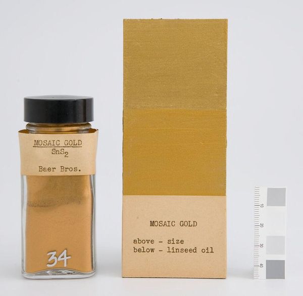 Curator: Here we have "Mars Brown," manufactured by Winsor & Newton, a simple, unassuming pigment sample. Editor: It feels…earthy, of course, but also strangely sterile. The neatness of the label and the jar contrasts so sharply with the raw color itself. Curator: It's fascinating to consider the symbolic weight we place on color. Brown, traditionally linked to the earth and nature, can also evoke feelings of decay or even mourning. Editor: And Mars, the red planet associated with war, combined with brown… does it hint at rusty landscapes, or perhaps the slow weathering of time? Curator: Perhaps. Or just a very specific shade of brown that some artist needed to capture their vision. Editor: Well, whatever the artist’s reason, it's certainly got me thinking about the power of color. Curator: Absolutely, it's a reminder that even the simplest things can hold layers of meaning.