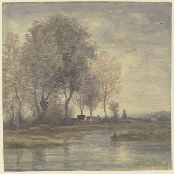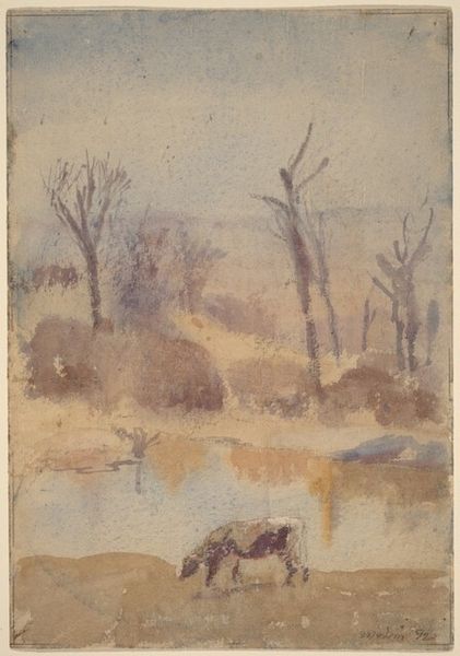 Curator: Looking at this landscape by François-Auguste Ravier from around 1880, rendered delicately in pastel, I am reminded of poetry. It whispers, doesn't it? Editor: Absolutely, I am immediately struck by this pervasive melancholic mood; everything looks to be suspended in a very ephemeral and almost sorrowful light. Curator: I find that quite perceptive! Ravier was deeply inspired by the Barbizon school and their reverence for the ordinary landscapes and the fleeting moments in nature; he often painted en plein-air capturing these raw emotions firsthand. Here he seems to explore the liminality between day and night. Editor: The hazy atmospheric perspective adds depth but also, crucially, conceals as much as it reveals; notice, for example, the attenuated silhouetting of the trees against the diffused twilight, then observe how they become a kind of barrier—or perhaps a frame—drawing us to question the nature of our engagement with the marsh itself. Curator: Precisely! Ravier's loose handling of the pastel captures this moment beautifully, almost like a memory fading, doesn’t it? Those pink and golden hues in the sky melt seamlessly into the muted earth tones, invoking an almost meditative mood. It invites reflection, rather than detailed observation. Editor: Note the use of contrasting tonal values within the work: Ravier plays here by using a muted color palette to amplify a strong distinction between areas of lightness, like in the upper parts of the sky, and dark tones around the base. This helps create a sense of depth that subtly draws the eye of the viewer toward an undefined focal point within the distant skyline. Curator: For Ravier, like the Romantics, art was not about precision, but expressing how nature stirred something deep within the soul. The very medium – pastel – enhances this fragility of feelings. Editor: Ravier manages to masterfully explore the dichotomy of light and shadow using minimalist components and thereby, effectively constructs and engages with our notions and emotional and sensorial recall, too. It's not only a study in composition but also, arguably, of semiotics itself! Curator: Yes, looking closer, one almost feels the dampness in the air, hears the rustling reeds. It’s truly a masterpiece of subtle observation and emotive landscape painting! Editor: Indeed, while compact, it nonetheless makes an impressive contribution to the atmospheric Romantic traditions.