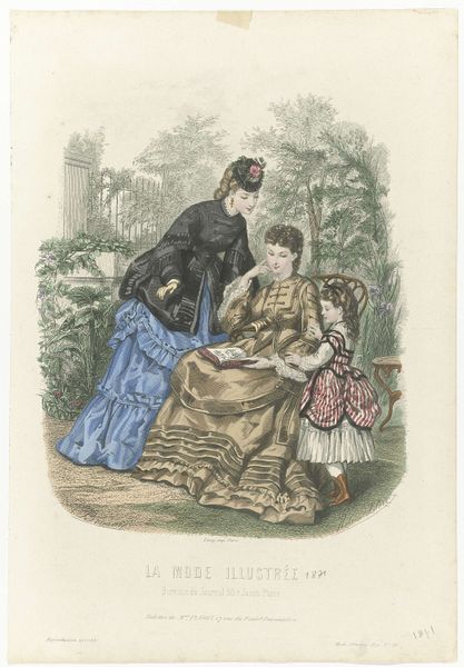Curator: Looking at this image, I’m immediately struck by a sense of both elegance and constraint, a visual representation of 19th-century bourgeois life. What do you think? Editor: I see it somewhat differently. It seems very posed and contrived, almost saccharine. Curator: Well, let's unpack that a bit. The print is from an 1869 issue of *La Mode Illustrée*, a popular French fashion magazine. The artist is J. Bonnard, and the title is quite a mouthful: "Toilettes de Mme Breant-Castel." Editor: Ah, context is key! So, not fine art, but an advertisement essentially. No wonder the poses look so carefully arranged. Were these illustrations a popular form of media back then? Curator: Absolutely. Publications like *La Mode Illustrée* played a vital role in shaping societal expectations. They were tastemakers that dictated trends, not just in fashion but in lifestyle, leisure, even morality. The print functioned as a powerful tool, influencing what women aspired to be. Editor: I find myself pondering what's absent. Where are the women who didn't inhabit that sphere of luxury and leisure? This single image suggests there’s one acceptable path, it normalizes a limited narrative for women. What impact did this have on disenfranchised populations? Curator: That's a very insightful point, how visual culture amplifies the values of the elite and contributes to marginalization. Looking closely, you see the detailed rendering of fabric and jewelry, an obsessive attention to detail…It's aspirational marketing, then and now, fueling the cycle of consumption. It serves to emphasize how this era shaped ideals and perpetuated power structures within art and society. Editor: Looking at it through that lens makes the image even more disquieting. Curator: Agreed, it is a complex work, sparking necessary questions around representation, consumption, and who controls the narrative, which remain pressing even today.
