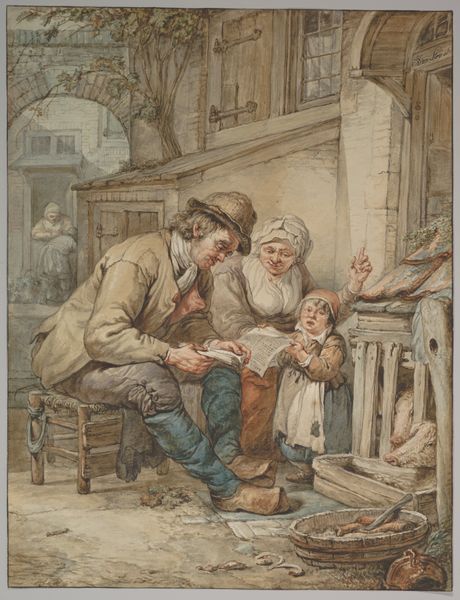 Cornelis Dusart's "Kitchen Scene," created around 1693, presents a tableau rich with symbols of daily life and fleeting pleasures. The open cupboard, laden with food, is a still life within a still life, evoking abundance and the bounty of domesticity. Note the figure drinking deeply, a gesture of momentary abandon. This act echoes in countless bacchanalian scenes throughout art history, from ancient Roman frescoes to Renaissance paintings, each a reminder of the intoxicating allure and potential pitfalls of excess. It’s a visual echo chamber, resonating with shared human experiences. Consider too the bread and fish—staples of nourishment, but also potent Christian symbols of the Eucharist and spiritual sustenance. These elements speak to the cyclical nature of life, where simple acts of eating and drinking become imbued with profound meaning, transcending their immediate context. Like the recurring motifs in dreams, these symbols resurface through time.