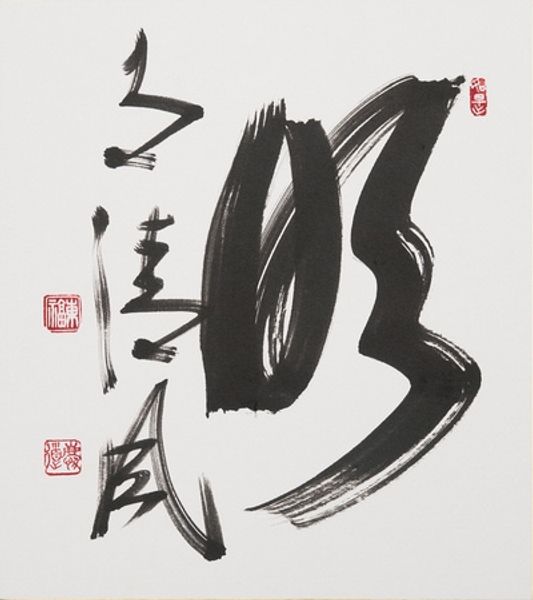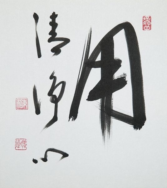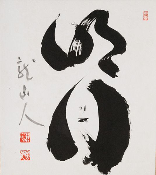Editor: This is “Flower” by Zenkei Shibayama, rendered in ink. It's striking how such simple materials can evoke such a powerful, almost gestural presence. How do you interpret this work, particularly in relation to the artist's process? Curator: What I see immediately is the sheer physicality of the making. Look at the varying pressures used to create those thick, bold lines versus the delicate wisps at the top. The materiality of the ink and the absorbency of the paper are crucial. This isn't just representation; it’s an index of the artist’s movements, the labor of creation laid bare. Notice the stamps, too; those speak to ownership, authentication, and circulation. Editor: It’s interesting you focus on the ‘labor’. I wouldn’t have considered calligraphy labor, more a… spiritual expression? Curator: And why shouldn't it be both? The execution of calligraphy is incredibly demanding. Consider the years of practice, the controlled breathing, the precise movements. Also, we need to understand the socio-economic context. Who was this artist? Who commissioned or consumed such work? These details root the "spiritual" in real material conditions. Editor: That makes me think about how ink, usually for writing or documents, is here purely expressive. Does that blur the lines between craft and fine art? Curator: Absolutely. The artist elevates a utilitarian material and technique to an art form, challenging the Western hierarchical art system, especially by using something readily accessible to all for what we might see as ‘high’ art. It forces us to confront our own definitions and expectations. Editor: This really changes my view of the piece. I see the intentionality behind the choice of materials, the action of the brush, the movement, even. I didn’t think I could get this deep just by analyzing ink! Curator: Exactly. By examining the materials and the means of production, we gain a richer understanding, disrupting traditional notions of what art *should* be. The flower blossoms, not just as an image, but as a testament to the artistry inherent in its creation.