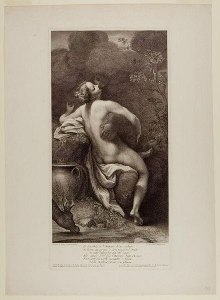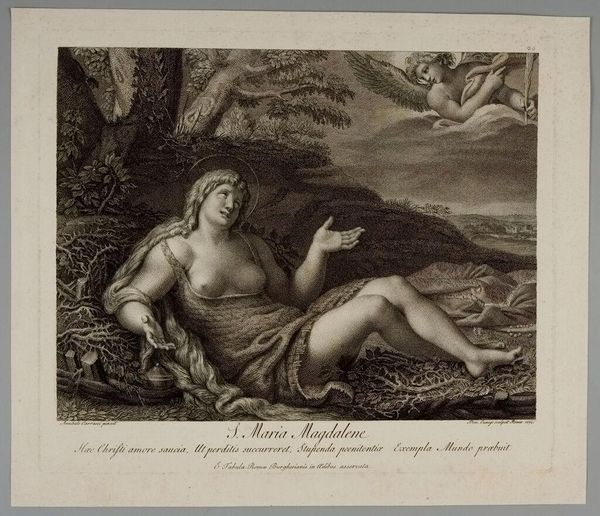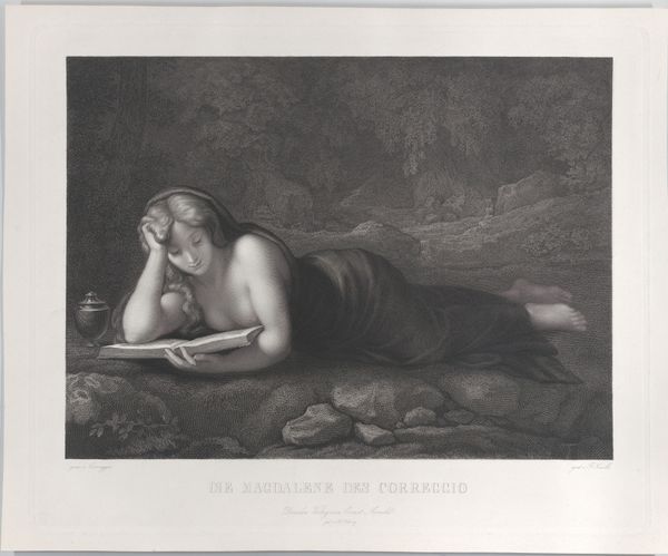 Editor: This is Jean Daullé's "Magdalen Reading," housed at the Harvard Art Museums. The etching has a very serene, almost melancholic mood, and the figure is beautifully rendered. What do you see when you look at it? Curator: Observe the tonal gradations achieved through Daullé's expert manipulation of the etching technique. Notice how the light falls across her form, highlighting the texture of the fabric and the smoothness of her skin. It's a study in contrasts. Editor: Do you think the composition is trying to tell us something about her state of mind? Curator: Precisely! The way the figure is positioned within the landscape creates a visual tension between vulnerability and introspection. The formal elements underscore the psychological depth. It is a masterful orchestration of form and content. Editor: That's fascinating; thank you for pointing out these visual cues. Curator: Indeed. It's through attentive analysis of form that we can unlock deeper meanings.