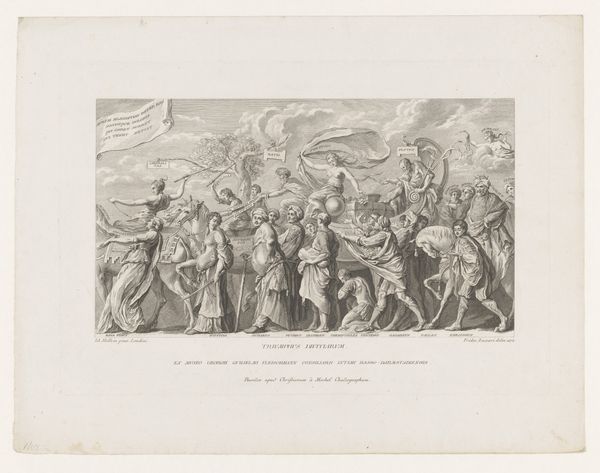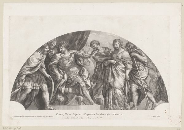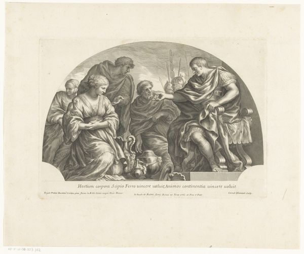 Curator: Immediately striking is the intense vulnerability radiating from the kneeling figure, enveloped in heavy drapery. Editor: Indeed. Let’s delve into this dramatic scene. What we’re looking at is an engraving dating back to approximately 1677, by Conrad Lauwers. The piece is titled "Sisygambis Kneeling Before Alexander the Great." Curator: The composition is remarkable; the stark contrast between Alexander’s powerful stance and Sisygambis's submissive posture speaks volumes about power dynamics and conquered status. I see elements that echo classical-realism infused with Baroque sensibilities. Editor: Symbolically, it's loaded. Kneeling traditionally signifies supplication, and here, it visually represents Persia's surrender to Alexander. The drape acts as a concealing shroud of status as well as defeat. It also appears to function almost like a Madonna's veil. What do you make of that connection? Curator: Fascinating idea. The positioning could hint at a plea for clemency, but within the framework of 17th-century European societal values. There is a fascinating juxtaposition between the victor who holds absolute power and the subjugated Queen, both are presented according to accepted behavioral norms. Sisygambis, therefore, is not diminished but rendered pious through engraving's traditional methods. It almost transcends the specific historical context of Alexander. Editor: I see what you mean. Lauwers is making broader statements about governance and authority, both divine and earthly. How significant would that context have been to viewers then? Curator: Enormously so. Imagery reinforcing divinely sanctioned power was critical amidst social upheavals. Pieces like this subtly propagated prevailing views on hierarchical systems. Art becomes less about the actual historical Alexander and more about his resonance within early modern socio-political rhetoric. Editor: It is quite a loaded representation! Reflecting on our discussion, one appreciates the way art can be made to function at different periods, in that the artist used symbolism in his figures as well as within their relationship. Curator: Agreed. This image underscores how artistic portrayals were instruments in reinforcing the existing structures of the world, revealing a story of shifting social consciousness and values, rather than just historical record.