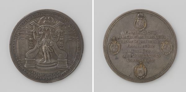 Curator: So, here we have a fascinating example of commemorative art: “Eeuwfeest der Ridderlijke Confrerie van de Handbussche te Delft,” a medal created in 1737 by Martin Holtzhey. It appears to be made of metal, likely silver or a similar alloy, fashioned into a relief. Editor: My initial impression? It's giving off serious ancient vibes, like something you'd unearth in an archaeological dig, you know? The figures almost seem to be emerging from the metal itself. Curator: The obverse side showcases a group of figures, seemingly allegorical, bearing flags and weaponry. The composition adheres to classical principles, striving for balance and clarity despite the miniature scale. Note how the artist uses the limited space to convey a sense of depth. Editor: I see what you mean, but the cramped feeling is a little intense for me. There is so much crammed into this tiny space. Almost like a silver dollar packed with all the history Delft could muster. You know, though, I feel like if it were cleaned and polished, all its gravitas would disappear! Curator: An astute point. Indeed, the patina contributes significantly to its historical presence. On the reverse, we observe an inscription detailing the occasion—the centenary of the Handbussche Guild. It includes text in Latin and heraldic elements—a visual representation of the organization's prestige and longevity. Editor: Ah, Latin, always a good sign! You see it means this is not some run-of-the-mill coin but it must have a really legit story! It all contributes to the atmosphere of old-world sophistication and just the overall momentous vibe, don't you think? It feels pretty grand, for something so tiny and functional. Curator: Precisely. This medal functions not only as a commemorative object but also as a historical document and an example of Baroque artistry—evident in the ornate details and the theatrical presentation. Holtzhey masterfully integrates symbolism and text to convey the Guild's legacy. Editor: Yeah, Baroque and kinda bad-ass—like these tiny dudes were super important back in the day and wanted to ensure that we didn't forget. So, now tell me, how much do you think it’s worth, just roughly? Curator: From a formalist perspective, its true value lies in how it reveals cultural narratives about the Guild’s place in society—encoded in its aesthetic and structural elements. Thank you. Editor: Okay, Professor. Well, thanks, this gives me something to think about next time I consider the worth of stuff and value of history.