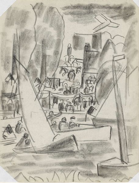 Curator: John Marin, around 1936, captured this bustling cityscape in an ink and pen drawing entitled "Untitled (Buildings in Construction)." Editor: Well, my first impression is…organized chaos. It feels very immediate, like a quick sketch from life, full of the raw energy of a city on the rise, but somehow… fragile? Curator: I see what you mean about fragile. Marin’s line is so gestural here, almost trembling. You feel the speed of the drawing, the artist trying to catch a fleeting moment. Given the economic climate of the 1930s, that frenetic energy might also suggest a societal unease lurking beneath all the building. Editor: Right, because what we see here are the skeletons of buildings, all these vertical lines shooting skyward—but also very precarious looking. I can't help but think about rapid urbanization and its discontents, like uneven development that deepens class divides, all wrapped in this masculine bravado around growth. There is almost no space for any human beings. Curator: Marin often portrayed cities this way – as living organisms, energetic and dynamic. Even though he uses a modernist language, it reflects a Romantic sensibility, of nature and of urban development seen as a raw expression of elemental forces at play, human and geological forces that intersect. This is a fairly consistent tension within the American Modernist project. He seemed fascinated by that moment when nature becomes overwhelmed by this artificial geometric space. Editor: Do you think Marin romanticizes it? This period marks a turning point where unregulated development and capitalist expansion dramatically altered our relationship to space, the commons, the climate, and the human itself. There is little, to me, that feels romantic about that violence. Curator: I think it’s more ambivalent than romantic. You can’t ignore the sheer exhilaration, the dizzying sense of scale, of being dwarfed but also empowered by it. The way he uses those thin, spidery lines to evoke height is remarkable. It feels…aspirational. He is trying to express and evoke a very strange brew of anxieties and optimism specific to a very American type of experience, isn't it? Editor: Agreed. The drawing is more complicated and unresolved than I initially thought. Seeing the individual caught at the bottom in an unhurried stride suggests this weird disconnect—as though one cannot integrate themselves into the structures of progress. Ultimately it evokes the contradictory emotional registers of modern life for me.