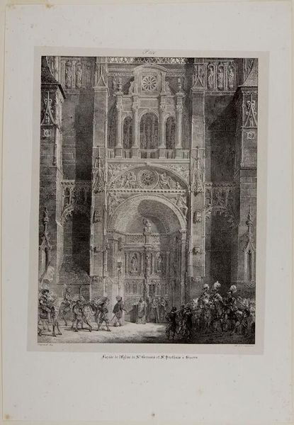 Curator: This is Thomas Higham's rendering of the Church of Saint Jacques in Dieppe. Note the architectural detail, the fineness of line in the engraving. Editor: It's incredibly evocative, almost dreamlike. The church looms, a symbol of enduring faith amid the bustle of everyday life. Curator: Precisely. The density of the facade, those repeating gothic arches—they create a powerful visual rhythm. Observe also the contrast between the ornate structure and the simplicity of the figures below. Editor: Those figures draw the eye, anchoring the church in lived experience. It's a testament to the enduring power of religious spaces, drawing communities together. Curator: The artist's focus on texture and form lends the building a monumental quality. Editor: It's more than that. The image is a vessel of cultural memory, holding centuries of worship and communal identity. Curator: Indeed, there's a compelling interplay between representation and symbolic weight. Editor: The power of enduring symbols laid bare, wouldn't you say?