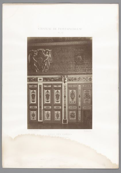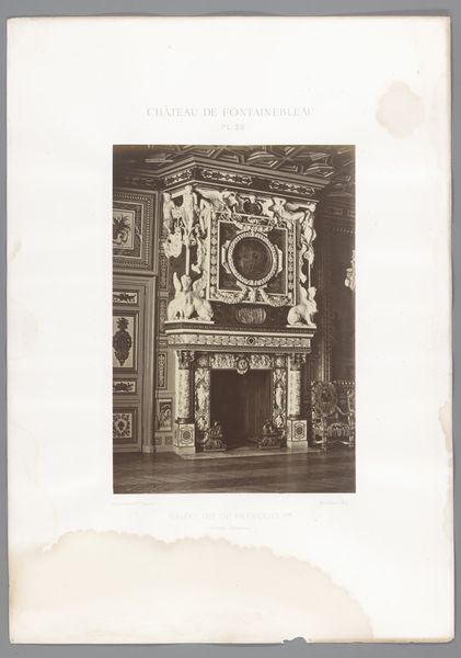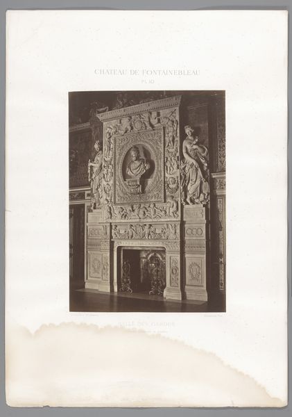 Curator: Let’s turn our attention to this photograph by C. Steenbergh, likely taken between 1885 and 1900. It depicts "Schouw in de voorhal van het Frans Halsmuseum te Haarlem," capturing a grand fireplace in the museum's entrance hall. Editor: My initial reaction? Opulence! The sheer size of that fireplace and the elaborate carvings practically scream wealth and power. I am very much drawn to the material presence of the object shown and how it manifests the cultural trends. Curator: Exactly. Consider that this image was created at a time when museums were solidifying their role as cultural institutions. The Frans Hals Museum, like many others, used its architecture and interior design to convey authority and taste. A photograph like this played a role in shaping public perception of the museum itself. Editor: Yes, and the materiality is key. It's a bit hard to tell just from a photograph, but it seems like we’re looking at various materials here. I notice the stone carving of what appears to be white marble, if not other varieties of quarried stones. I also see a metal decorative plate on the floor of the opening. So, what processes and types of labour are we talking about here? From extraction, transportation to its ultimate creation and place as a decorative art form. Curator: That’s right. Each choice, from the subjects painted on the mantle to the cherubic figures adorning it, reflects a specific cultural agenda. The building becomes an art form in itself, meant to instill both reverence and civic pride. Note how its placement within the Frans Hals Museum helps preserve that heritage. Editor: Right, and thinking about photography as a medium here too. It captures and reifies this crafted display, mass producing that message of power, luxury and craftsmanship. I wonder what sorts of social networks played a role to maintain and display such status objects. Curator: So while the image documents a beautiful object, it simultaneously reinforces certain social and cultural hierarchies that were prevalent at the time. Editor: I agree, analyzing it allows us to really dig into those layered social dynamics inherent to both the production and the space. Curator: Looking at this photograph offers a chance to unravel the complex story of not just a museum, but of art's role in shaping social narratives. Editor: Definitely a rich example for us to dive deep and observe the processes of labor, class and visual representation on view!