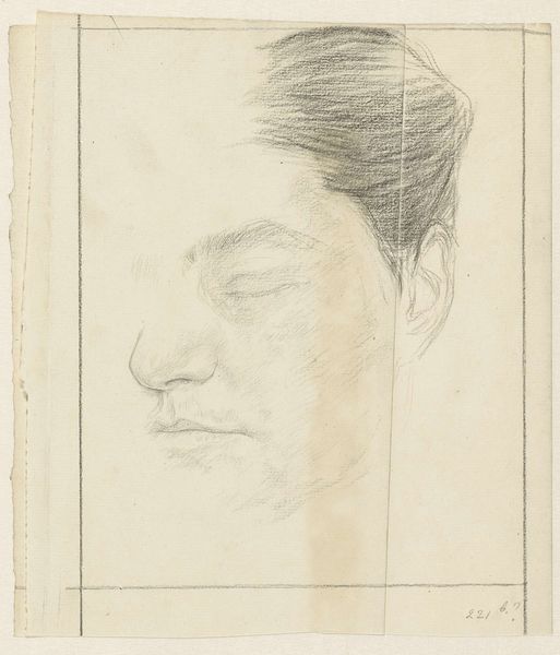 Editor: This is John Singer Sargent’s sketch, “Front View of an Egyptian Pharaoh's Head.” It’s a small pencil drawing, quite delicate, but the face is so serene. What do you see in it? Curator: Sargent's choice to depict this pharaoh with closed eyes evokes a sense of timelessness. Consider how the closed eyes might function symbolically—a gateway to the afterlife, or perhaps representing inner wisdom? Editor: I hadn't thought of it that way. It feels like a peaceful rest. Curator: Indeed, and beyond that, consider the historical context. Sargent, an American artist, studying Egyptian art. What cultural weight does that encounter hold, transferring ancient symbols to a modern eye? Editor: That's fascinating! It makes me think about how symbols change meanings over time. Curator: Precisely, and how artists reinterpret them. Editor: Thanks! I never would have considered all that.