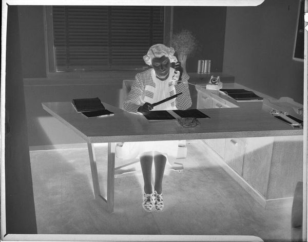 Curator: This photograph, simply titled "Untitled," by Martin Schweig, captures a very intimate space—a desk adorned with personal objects. Editor: There's a melancholic air about this image. The grayscale and the composition create a sense of quiet contemplation. It feels like a stage set for a memory. Curator: Absolutely. We see a wedding portrait, a rose, and a pen, each holding stories within stories. The desk, typically a place of work, becomes a repository of love and longing. Editor: The photograph almost begs us to consider whose story this space tells. Are we meant to see it as a space of domesticity or professional reflection, and how have these identities been shaped by the historical contexts of marriage and work? Curator: I see the mirror’s reflection as an opening into another world, inviting dreams and fantasies that soften the hard edges of everyday life. Editor: It could also be a reflection on gendered expectations, and how women are often confined to these intimate, domestic spheres. Curator: This work resonates with me, urging us to find beauty and meaning in the most personal corners of our lives. Editor: For me, it encourages a deeper conversation about who has access to these private spaces and the power dynamics inherent in our everyday surroundings.
