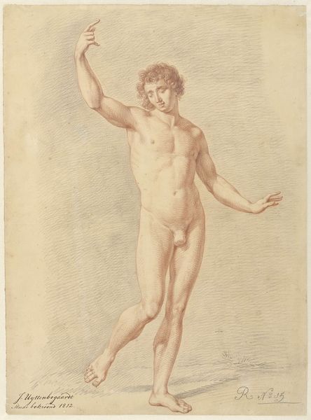 Editor: So, here we have Jan Tersteeg's "Standing Male Nude with Lyre, as Apollo," likely from 1789, done in pencil. It feels…understated, almost academic, given the classical subject. What stands out to you? Curator: What I find interesting is the interplay between the apparent subject, Apollo, and the actual *making* of this piece. It’s a drawing, a study. Notice the labor, the graphite on paper. The academic art system used these to train artists and create art as a status symbol. Editor: You mean, beyond just depicting Apollo, it's also about showing skill and adhering to artistic standards? Curator: Precisely. Consider the socioeconomic context. Paper, pencils—these were commodities. The artist, likely trained within a certain workshop structure or art class, is showing us their abilities to the patron class. What were the patrons intending with works like this one? Editor: To showcase refinement, perhaps? The ability to afford both art and artists capable of recreating these classical ideals? Almost a branding exercise? Curator: Absolutely. Think about how the art market and academic art reinforce each other at this moment, reinforcing cultural values. What's more striking, then – the classical reference, or the display of technical proficiency born out of labor? How are traditional boundaries between fine art, draftsmanship, and social standing challenged, as the role of the labor required to complete the drawing itself emerges? Editor: That’s a very different perspective than what I initially saw. Now I see this drawing not just as a neoclassical artwork, but as evidence of 18th-century artistic training and social positioning. Curator: Indeed. And the very act of sketching it out of graphite makes it more of a product of craft or labor than some idealized god. It reminds us that artworks are never neutral; they always carry the marks of their production, the material conditions and the societal aspirations of their creators.