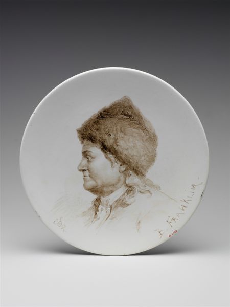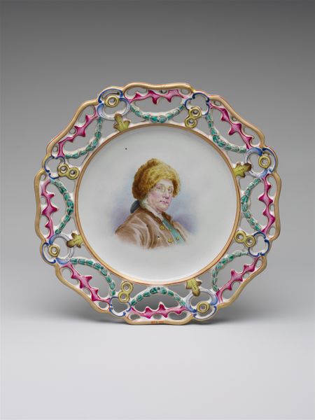 Editor: This curious object, entitled *Portret van Willem I*, dates from around 1800 to 1825. It’s attributed to an anonymous artist and rendered on ceramic. The whole presentation on a plate gives it an interesting sense of domesticity. What's your take? Curator: Indeed! The presentation on a plate, specifically Delftware, elevates this portrait of Willem I from mere commemoration to something intertwined with daily life. Consider the socio-political climate: how did this act of domestic display reinforce, or perhaps even subtly negotiate, power? Editor: Negotiate power? How so? Curator: The accessibility of Delftware meant portraits weren't just for the elite. Owning this plate allowed ordinary people to literally "consume" the image of their leader daily, suggesting a level of intimacy. However, the very act of putting Willem I on a plate also subtly democratizes him, blurring the lines of reverence. Does it humanize or diminish him? Editor: That's a really interesting tension! So the artist, while anonymous, is participating in a larger conversation about leadership through this medium. The imagery itself also recalls Neoclassical aesthetics of that era too. Curator: Precisely! How do you think Neoclassical principles might function within this more common form of decorative art? Editor: I see the portrait itself is somewhat idealized, very stoic and reserved like those typical austere, classicizing bust sculptures. Placing that within something useful democratizes that, I think. The decorative border does not have any connection with the portrayed subject; it could almost be anything! I'll need to think about it more. Curator: It's a wonderful demonstration of how historical context shapes even the most seemingly straightforward portrait. Something that looks 'folksy' and historical may in fact be politically charged!