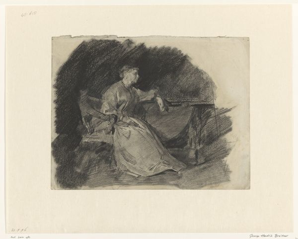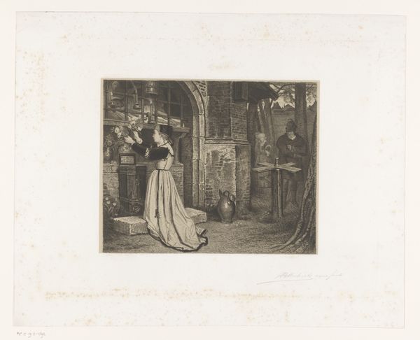Editor: This is *Seated Young Woman with a Circus Monkey* by Fr. van Groeningen, created in 1884 using etching. I find the figure striking. Her pose suggests boredom or contemplation. What symbols are present, and how can we interpret them? Curator: Indeed, the woman's gaze and posture are powerful visual cues. But it's the supporting cast that sings to me: the "circus monkey" which seems more like a toy soldier, the drum on which she rests her arm. Considering her adornments, does this intimate glimpse tell a fable about beauty versus commerce? Editor: Beauty versus commerce? Tell me more about that idea. Curator: Look at the toy soldier. Is it a masculine symbol, an omen for sacrifice and military prowess? And then look at the young woman: elaborately coiffed with beautiful roses and pearls. What part do these symbols of femininity play in defining gender roles of that era? What price must beauty pay to commodify herself? Editor: So you are saying the painting makes an explicit commentary of sorts? That it seems to criticize or at least analyze the role of women at the end of the nineteenth century? Curator: Or perhaps asks, "what is woman's role in this emerging capitalist world?" Are all of her accoutrements her own choices? Are any? The circus monkey itself points to an artificial and caged world...a loss of wildness, shall we say? Editor: It's remarkable how such a seemingly simple image can hold so much symbolic weight, revealing the complexities of the society that created it. I will have to view other pieces of the era! Curator: Exactly. And these kinds of objects always provoke deeper thought and more questions for me, which is, in itself, an important revelation.