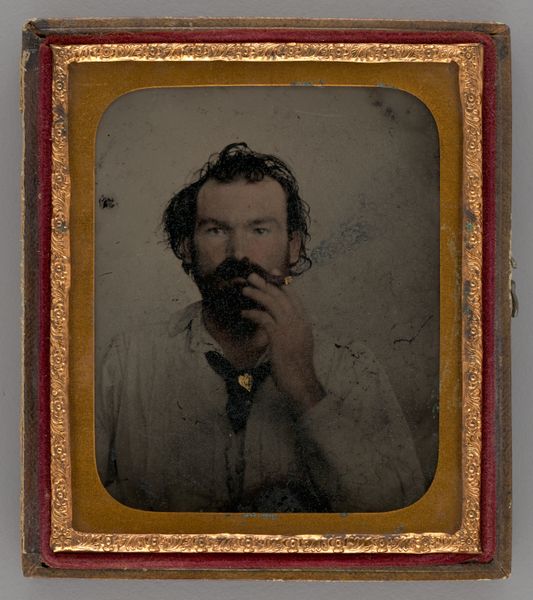This untitled portrait of a man smoking a pipe is a small, early photograph presented in a decorative case at the Art Institute of Chicago. The anonymous photographer has captured the sitter with striking clarity using the daguerreotype process. Notice how the composition is anchored by the strong diagonal line of the pipe, drawing our eye from the base to the subject’s face. The tonal range is narrow, with subtle gradations that create a sense of depth. The framing of the man with his hat creates an interesting contrast between light and shadow. This portrait can be interpreted as a study in contrasts: between the fleeting nature of life and the desire for permanence through representation. The act of smoking, often associated with contemplation, imbues the image with a certain philosophical depth. While seemingly straightforward, it challenges fixed notions of identity and invites ongoing interpretation.