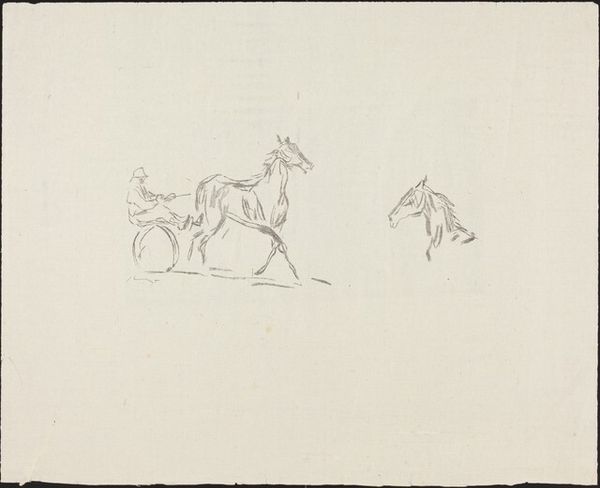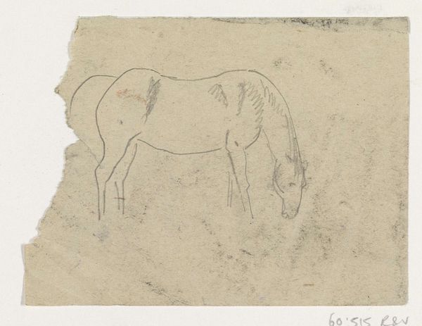 Curator: Before us is "Drie paarden" by Leo Gestel, dating from around 1891 to 1941. It's a pencil drawing here at the Rijksmuseum. Editor: Immediately, what strikes me is the raw energy. It’s a sketch, yes, but the quick, confident lines suggest a deep understanding, perhaps even an affinity for the animal form. Curator: Precisely. Look at the economy of line, the way he captures the essence of the horses' musculature and stance with such brevity. Notice especially the relationships among them; it is almost an academic study in comparative anatomy. Editor: For centuries, the horse has been an emblem of power, freedom, and nobility across numerous cultures. Do these particular renderings evoke such traditional symbolism for you, or do they seem more intimate? Curator: I am less interested in overarching iconographic narratives here. For me, it is about Gestel's process of reducing the horses to their basic shapes—almost as abstract, formal exercises. See the flattened planes and the angular junctions forming these animal bodies. The overall texture, too, enhances their somewhat abstract quality. Editor: Even these minimal lines, for me, conjure feelings. The top-most figure seems poised, almost apprehensive. The horse depicted at the bottom displays a kind of stalwart energy, while the center figure seems a bit more withdrawn or melancholic. Perhaps each one references a different aspect of the human condition, if you read into it that way. Curator: Possibly, but what I find really striking is the spatial ambiguity created by the overlapping figures and their relative placement on the paper’s surface. This tension suggests an active mind constantly reevaluating perceptions. The white of the paper becomes more than background, it becomes a structural component. Editor: Absolutely. Gestel gives us a sense of perpetual becoming here—a fluid interplay of possibility rather than a static depiction of concrete form. There is power in incompleteness, isn’t there? Curator: Agreed. The piece embodies not a final, polished image, but an invitation into the artist's mind and his structural thought process. Editor: Yes. This exploration truly uncovers how simple lines can convey profound emotion and resonate deeply across different eras and individual experiences.