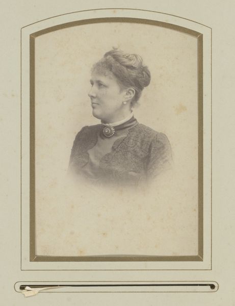 Editor: So, we're looking at "Portret van een vrouw," a gelatin-silver print from somewhere between 1860 and 1890, attributed to Ch. Brandebourg fils. It feels very formal, but also strangely intimate. What catches your eye about it? Curator: For me, it’s the photograph’s status as a material object that intrigues. Consider the labor involved. Not just the photographer's, but also the industrial processes necessary to create the gelatin-silver print itself, from mining the silver to manufacturing the photographic paper. Who had access to this new technology and how does that reflect social inequalities of the period? Editor: That's a perspective I hadn't fully considered. Thinking about the process and materials definitely shifts my understanding. But how does that understanding affect our appreciation of the portrait itself? Curator: The subject's clothing provides insight, doesn’t it? The materials, likely machine-made lace and embellished fabrics, point to a level of affluence afforded by the rise of industrial production, affecting fashion and its consumption during this period. Don’t you find it all too neat that her material self speaks volumes about socioeconomic circumstances of women back then? Editor: Definitely! Now I'm looking at this portrait as less about just one woman and more about this specific moment in the industrial revolution and the means that allowed for this portrait to be conceived, produced and even consumed as commodity by her, the subject. It also feels kind of unsettling because this type of photography made painting a thing of the past, like as if the materials consumed traditional practices. Thank you for this. Curator: Exactly, we're seeing a whole shift in art driven by material conditions.