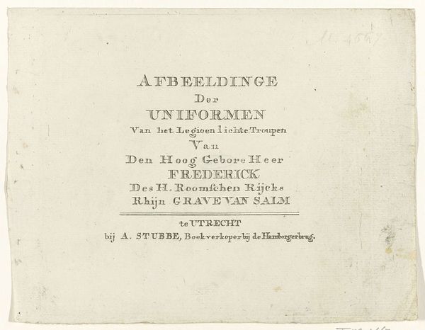 Editor: Here we have an engraving from 1785, currently residing in the Rijksmuseum. It’s titled "Serietitel," and its creator is listed as anonymous. It looks like a title page, a somewhat formal announcement rendered entirely in precise lettering. I find its austerity and order quite striking. What do you see in this piece? Curator: Ah, yes! "Serietitel." Just rolls off the tongue, doesn’t it? Well, I’m immediately drawn to the way it whispers of a very different time. The late 18th century! Imagine quills scratching across parchment, the meticulous work of crafting each letter. It's not just information; it's a performance. Look closely at the different letter sizes and fonts. What does that tell you about emphasis and hierarchy back then? Almost like a Baroque symphony, wouldn't you say, but played out in ink. It practically smells of old paper and political intrigue, don't you think? Editor: Yes, now that you mention it, the varied fonts do feel…performative. So, what story do you think it's trying to tell? Curator: I think it's subtly boasting! Announcing the arrival, or perhaps the commissioning, of a series about military uniforms – very fashionable at the time, you know. And note the honorifics bestowed upon Frederick, this "Rhijn Grave van Salm." Titles were currency! The engraver isn't just creating art, they are crafting an image of power, tradition, and perhaps even a dash of the new 'military chic'. We take typography for granted today, but back then, it was another sword in the arsenal of representation. Makes you think, doesn't it, about what our fonts will say about us in a few centuries. Editor: That’s fascinating. I hadn’t considered the performative aspect so explicitly. Now, I’m seeing this “title page” as something more complex, a kind of subtle, formal marketing piece. Curator: Exactly! And that, my friend, is why history, even when whispered in tiny letters, is endlessly surprising. Now, about that Grave van Salm... what kind of man do *you* imagine he was? Perhaps a military fop, or a courageous commander? It’s all in the interpretation!