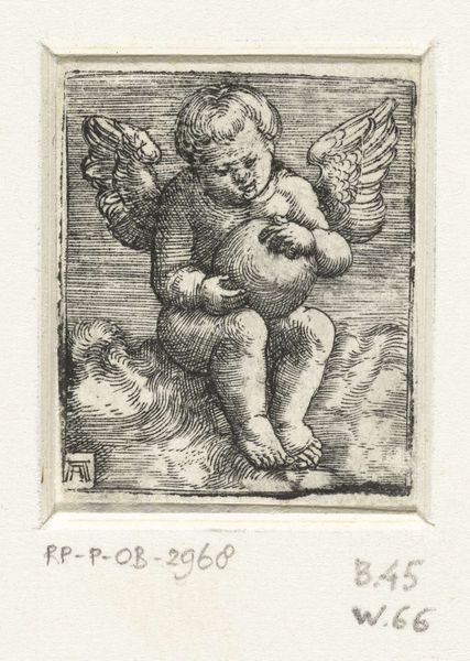 Editor: Here we have Cupid Asleep, an anonymous print from the Harvard Art Museums. The details are incredible for such a small piece. What stands out to you? Curator: I see an intriguing commentary on labor. Cupid, the god of desire, is rendered powerless, his tools discarded. The printmaking process itself, the labor of the engraver, contrasts with the idle Cupid. Editor: So, you're saying the artist's work highlights Cupid's lack of it? Curator: Precisely. The materiality of the ink and paper becomes a stand-in for the absent energy of the god. The means of production become the message. Editor: That’s a fascinating way to look at it. It makes me think differently about the artist's role. Curator: Indeed, art's meaning is in its making as much as its subject.