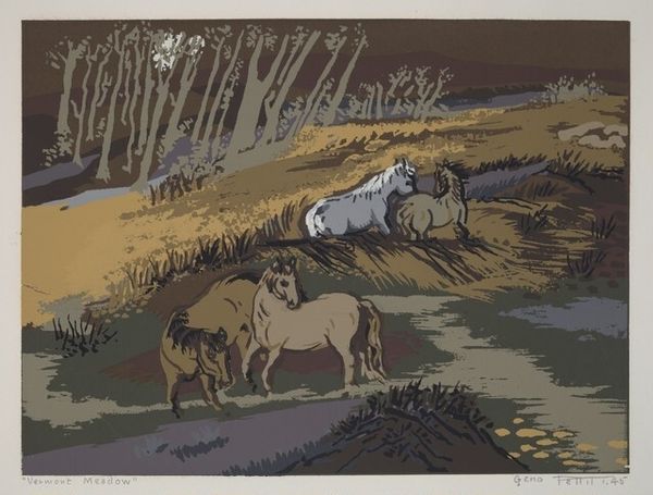 Curator: We’re looking at Guy MacCoy’s “Vermont Grazing” from 1944, a linocut print showcasing a bucolic scene. What strikes you first about it? Editor: It has this beautiful, almost melancholy stillness, doesn't it? Like a memory fading at the edges. The colours are muted and blocky, but it evokes a strong sense of place. Reminds me of driving through New England in autumn, seeing those ancient apple trees. Curator: The medium is critical here. Linocut is a relief printing technique; think of it as carving away the negative space. MacCoy’s skillful use of it gives us a simplified landscape and speaks to the proliferation of printmaking in the era as affordable art for the masses, during wartime constraints. Editor: The choice of such a handcrafted method is lovely. The roughness, the imperfect edges - it adds to that feeling of looking at something handmade, something precious created in that moment. You can imagine him really focusing on this cow…and maybe I'm projecting here but I almost smell hay. Curator: Right. The simplified forms—the cattle rendered in just a few tones each— speak to a focus on the essence of rural life, and his specific mark-making highlights an interesting conversation with the artistic currents of social realism as an artistic response to the social conditions during the war. Editor: And those blues he used - not a happy, sunny sky blue. The whole mood makes me think not just of farming, but a simpler time... an idealized moment we might yearn for in the hustle of modern life. Even though it was created in the context of wartime anxieties and realities, which also contributes to a somber emotional read of it. Curator: Precisely! MacCoy manages to offer a commentary on agrarian realities through an artistic lens deeply informed by craft traditions and the broader socio-economic pressures around consumption of the arts. It brings high art and craft production into this interesting conversation, doesn’t it? Editor: Absolutely. It reminds me that art doesn’t have to be grand to be meaningful. This slice of rural life, captured with such simple beauty, is profoundly touching. Curator: Agreed. It showcases how printmaking democratized art and captured crucial glimpses of life, labour, and landscapes of America. Editor: Well, on that note, I'm now dreaming of cows and Vermont apples. I need a vacation.
