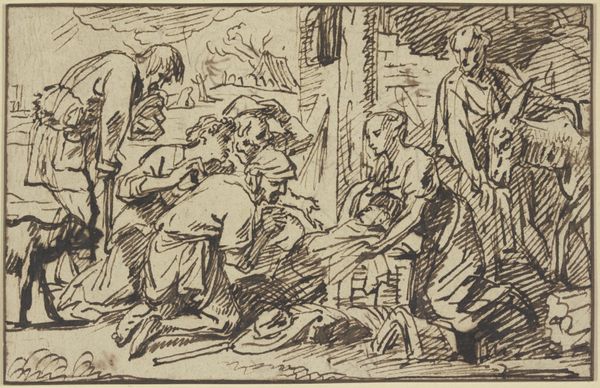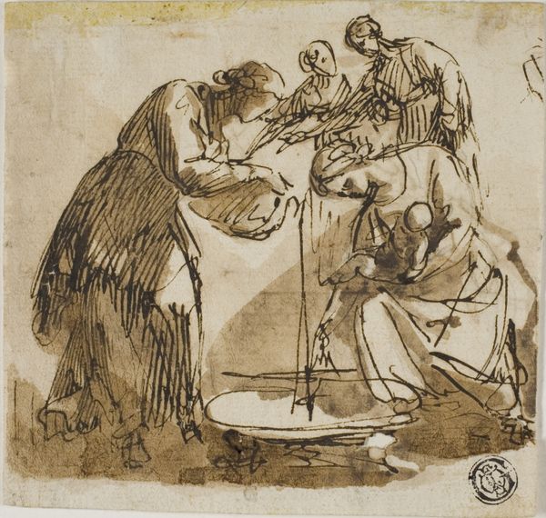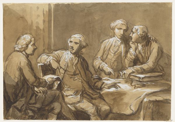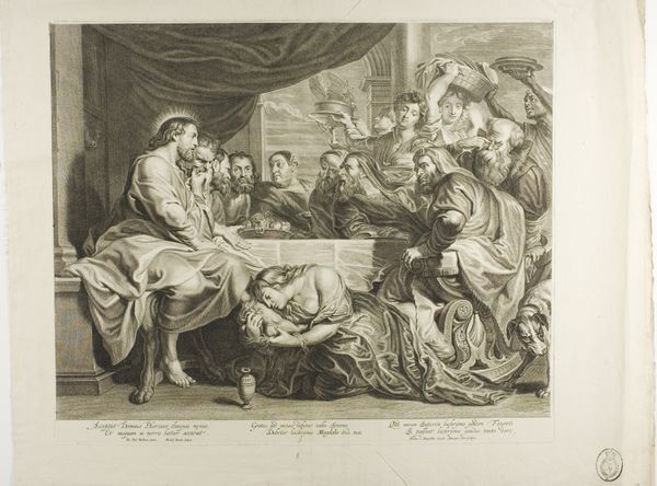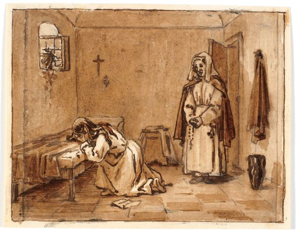 Curator: Here we have Alphonse Legros’ 1861 etching, "The Truth in the Case of Mr. Waldemar." What strikes you most immediately about this print? Editor: A palpable sense of dread permeates the scene. The claustrophobic interior, the figures huddled around the bed, and the grim expressions collectively suggest a weighty atmosphere. Curator: Precisely. The artist's use of etching to render this interior space and these figures invites a rigorous decoding of line, form, and composition. Notice the dense network of lines creating tonal variation, building depth within the confined space. How do these structural elements reinforce the narrative? Editor: I'm struck by how the artist uses a deathbed scene to explore broader social anxieties and moral issues of the time. I believe that considering the historical context can bring greater meaning to this depiction. The ailing Waldemar could represent the disenfranchised, whose voices and truths are suppressed by the dominant narratives of society. Curator: While your interpretation rightly seeks to broaden our understanding, I am most interested in examining how Legros orchestrates the distribution of light and shadow, structuring a spatial organization that leads the eye toward the central figure. Consider how that direction contributes to the thematic core of this etching. Editor: Indeed, the interplay of light and shadow sculpts the scene's emotional landscape, drawing us closer to the reality of human vulnerability. Legros powerfully reveals society's uneasy relationship with illness, mortality, and care—themes ever relevant and profoundly human. Curator: It’s clear, though, that his careful construction transcends mere historical documentation. It becomes an aesthetic study in texture and form. Editor: I can agree that its artistry amplifies its commentary on truth and visibility. It is a profound visual statement on bearing witness, and an urgent reminder of our responsibilities toward one another.