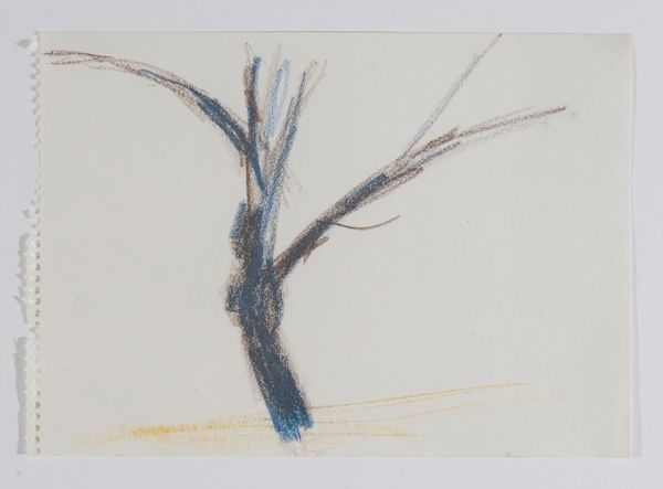 Curator: This is an untitled work by Phyllida Barlow, part of the Tate Collections. Editor: The raw, immediate quality of this piece strikes me first. The composition feels quite audacious. Curator: Barlow often uses humble materials to create imposing sculptures, challenging the conventions of monumentality. Here, we see that sensibility at play on paper, perhaps as an exploratory sketch. It’s interesting how she grapples with mass and volume. Editor: Absolutely. The rapid, almost brutal brushstrokes coalesce to suggest volume, but the thin washes of color also flatten the space. There's a tension there that keeps the eye engaged. The use of black provides contrast. Curator: Barlow’s work often reflects on the urban environment and the decay of industrial spaces. This piece, though abstract, echoes those themes through its rough textures. Editor: I find it interesting how the implied weight of the blue form contrasts with the fragile-looking support system. It feels unstable. Curator: I agree. The sketch certainly captures Barlow’s interest in disrupting expectations. Editor: It's a powerful testament to her ability to communicate complex ideas with such simplicity.