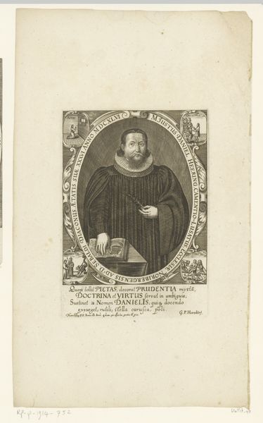Christian Romstet created this portrait of Johann Maukisch, likely as an engraving, sometime between 1640 and 1721. Maukisch was a rector, theology professor, and pastor, who was born in 1637. The image reflects the cultural and religious context of the 17th and early 18th centuries. The Latin inscriptions and the symbolic imagery are typical of the intellectual and religious elite of the period. Maukisch's role as a pastor and professor places him within a highly educated, predominantly male, social class. The portrait also speaks to the complex relationship between religious identity, personal expression, and public representation. The symbols and inscriptions reflect deep spiritual convictions, and Maukisch himself is positioned as a figure of authority, knowledge, and piety. It invites reflection on how individuals construct and perform their identities within specific historical and cultural contexts.