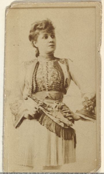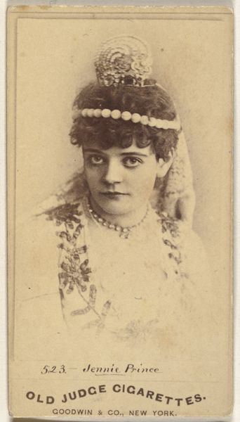 Curator: The photograph before us, currently held at the Minneapolis Institute of Art, is an albumen print portrait made by Jeremiah Gurney between 1869 and 1874. The sitter, thought to be an actress, remains unidentified. My first thought is opulence. The cascading pearls, the elaborate hair. It speaks volumes about performance and identity, even without knowing who she is. Editor: I find the almost tangible ambition fascinating—she's performing wealth, class, success in a burgeoning theater world where identities are being crafted, bought, sold… the very fabric of celebrity being woven. The portrait embodies those transformative energies, where one could self-fashion into something entirely new. Curator: Right, there's a studied elegance in the details, isn’t there? Gurney has really captured that "look." And in such incredible detail for a photographic portrait from this era—the texture of her curls, the almost defiant gaze... The softening effect from the albumen print lends a certain romance to the scene, despite the very composed posture of the subject. Editor: Absolutely. Though it may have aimed at capturing timeless beauty, what really stands out is how the portrait, itself, tells a story about women artists navigating restrictive environments, the gilded cage, the beauty standards… This albumen print whispers those intersectional power dynamics. Curator: The use of light in Gurney's composition seems to be doing quite a bit of storytelling on its own. Light defines the volume of her hair and illuminates that knowing gaze, leaving so much in shadow. I like that ambiguity... it hints at an inner life not entirely for public consumption. Editor: The shadows, I feel, serve to both romanticize and somewhat obscure—what are we not meant to see? We look back on such portraits with 21st-century eyes now and reflect on how much women’s labor and social maneuvering contributed to making such public performances possible in those historical and economic realities. Curator: Seeing it this way makes the absence of her name almost deafening, a gap in history we must consider. But, there is, undeniably, some force there that holds the viewer still, that asks to be engaged even now. Editor: Exactly. To truly consider works like this, beyond technique and beauty, we must really ask, what hasn’t been photographed? Who is conspicuously missing?
