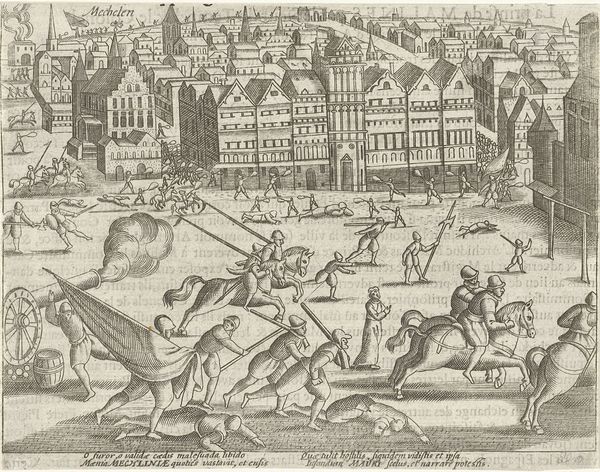 Editor: Here we have Philips Galle's "Vleesmarkt," created sometime between 1582 and 1633. It's a busy Northern Renaissance cityscape rendered as an engraving. The detail is impressive, but it also feels a bit chaotic, maybe even violent. What stands out to you when you look at it? Curator: The market scene teems with symbols of both sustenance and mortality. The animal carcasses displayed are obvious reminders of our dependence on life taken, but look closer. Notice the architecture; it represents the enduring strength and stability of the city itself. It's a fascinating juxtaposition, isn't it? A bustling marketplace built upon the very real cycle of life and death. Editor: I see what you mean. It’s not just a simple snapshot of daily life. Does the composition – all those lines converging on the center – play a role in emphasizing this cycle? Curator: Absolutely. The linear perspective draws your eye to the center, where much of the butchering action happens. This intentional placement directs us to contemplate the transformation of living creatures into commodities. This action also takes place near the cross. Think about the religious connotations embedded in this choice. Editor: It's pretty striking, connecting the marketplace to larger themes. The architectural symbols with its chaos. And religious connotation right in the middle! This is clearly much more than a simple market scene. Curator: Precisely! Consider also, this scene immortalized as a print—mass-produced! It offered people far removed from the urban center a window into both the glories and grisliness of city life, solidifying certain visual archetypes for generations. Editor: Thank you, I never would have thought about that, it brings so much to it.