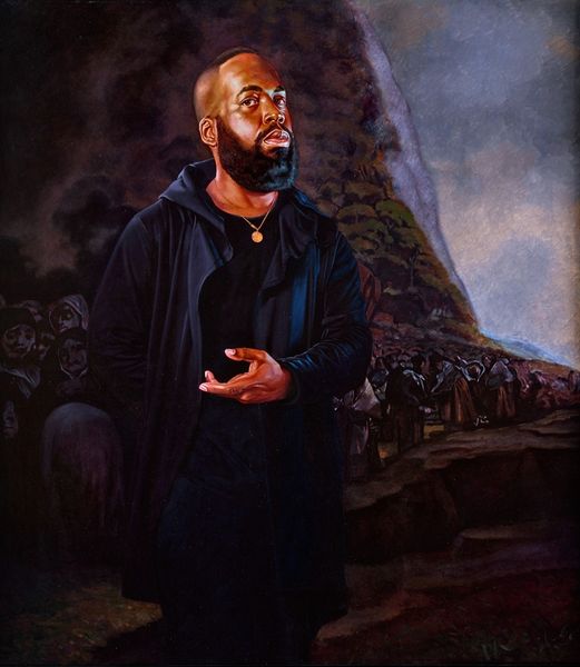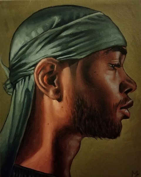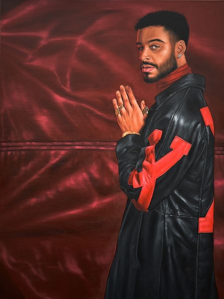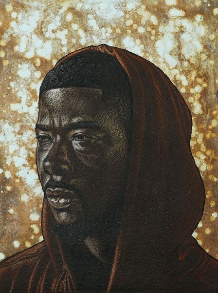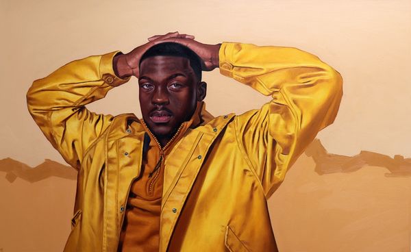 Curator: Alright, let’s talk about "James" by Monica Ikegwu, painted in 2021 using acrylics. What's your initial take? Editor: It strikes me as incredibly poised, almost like a modern-day Byzantine icon, bathed in that gold light, except instead of a saint, we have… well, James. There’s a regal quality but also a hint of something almost melancholic in his expression. Curator: I see what you mean. The golden-brown palette and the subject’s averted gaze create this atmosphere, but there's also something intimate and knowing. Ikegwu's realism invites you to search beneath the surface. What do you notice in his stance and garb? Editor: That durag is clearly a deliberate choice, speaking to contemporary urban identity and the layers of cultural meaning it carries, the folds casting subtle shadows like drapery in an old master's work. The shiny bronze jacket hints at performance wear or activewear—the symbolic attributes that root this man in this era. I find his eyes arresting, somehow—he looks wary, yet inviting you into his gaze. What do they convey to you? Curator: You’ve nailed the durag's presence—a complex signifier right there on his head! And yes, the averted gaze—it could suggest self-awareness, shyness, maybe even vulnerability. His is no gaze into a mirror: there is much outside himself that holds his focus. He feels incredibly grounded in the moment despite this. Do you agree? Editor: Grounded, but like he's about to take flight. Perhaps that's why the eyes have me so gripped, he carries wisdom, and seems ready to use it! Tell me, what is the artist trying to say? Curator: Well, that is a tough call, isn’t it? Perhaps a quiet declaration of self-possession, the contemporary everyman elevated through skillful rendering and a distinct sense of style, his gaze conveying a resilience rooted in what seems a profound quiet. Editor: Beautifully put! I can see this work functioning almost like a secular icon—an image imbued with presence and meaning for a new era, echoing a lineage while resolutely claiming its place in the now. Curator: Yes, precisely, it’s a powerful piece with many layers! Editor: I will hold that close. Now if you will excuse me, I need to contemplate these mysteries myself. Thank you for drawing out some insightful threads today!
