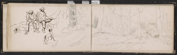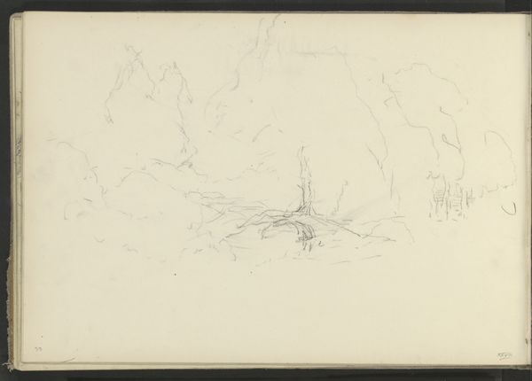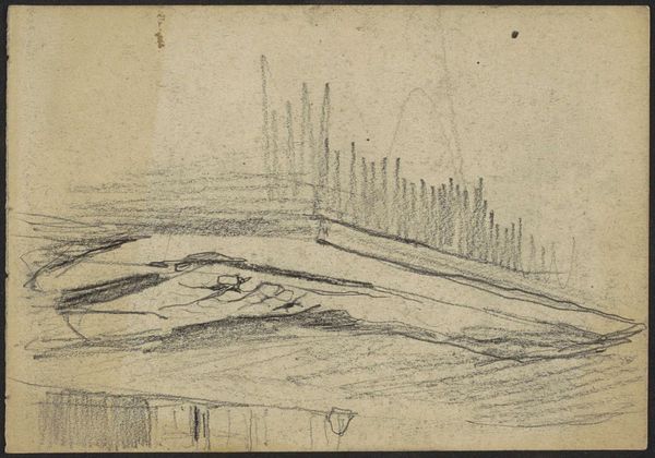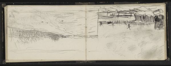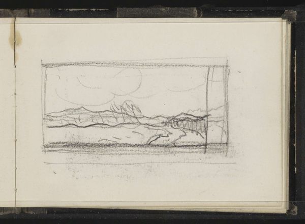 Curator: Let’s turn our attention to this drawing, "Huis in een heuvellandschap," or "House in a Hilly Landscape," by Anton Mauve. It was likely created between 1848 and 1888 and is now housed in the Rijksmuseum. Editor: Immediately, I'm struck by the immediacy of the lines. It feels like a fleeting impression, almost captured mid-thought. The tonal range, or lack thereof, lends the whole piece an air of transient quietude. Curator: Mauve’s work sits interestingly within the context of Dutch landscape art and his ties to the Hague School, reflecting a movement away from idealized landscapes toward more realistic and intimate portrayals of rural life and landscapes. These kinds of images became symbols of Dutch identity and tradition during a time of rapid social change. Editor: Precisely. Consider how the structural composition – that stark, rudimentary dwelling centered against the gentle slope -- dictates how our eyes navigate the scene. The lines themselves appear hastily laid, yet they create a space and depth which feels... authentic. Curator: It is fascinating to see how Mauve uses a simple medium like pencil and perhaps some ink to portray what for city dwellers represented simplicity. But, of course, rural life held its own complexities, which were becoming increasingly visible and problematic during the time. Mauve came to represent rural realities, class, and labor within his body of work. Editor: But even divested of any sociological underpinnings, we can admire its masterful strokes and minimalist presentation. The way he suggested shape through shadow, the way line and negative space interplay... the house, the hills--mere suggestions rendered complete by artistic economy. Curator: Absolutely. Mauve provides an image that speaks to us about Dutch identity while quietly inviting us to investigate our own relationships to ideas of "home" and place within broader national narratives. The roughness also offers insights into the process of creation, presenting the unedited labor and journey of idea to the viewer. Editor: It does inspire reflection. The piece, regardless of the artist's intentions, functions beyond mere reportage. Its strength resides not in meticulous detail but in emotional resonance – a quiet reflection on home that still stands to us now.