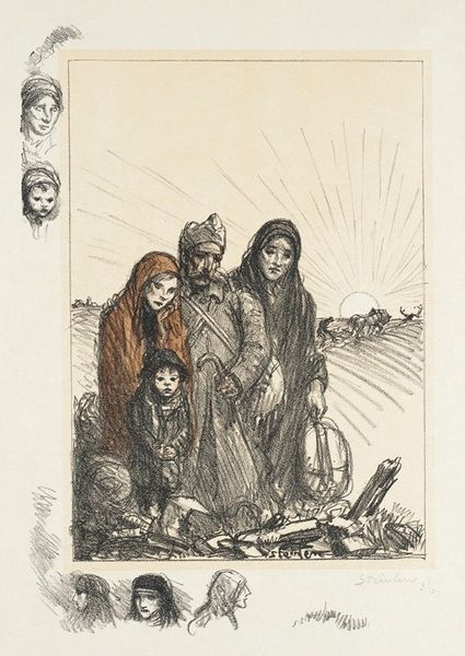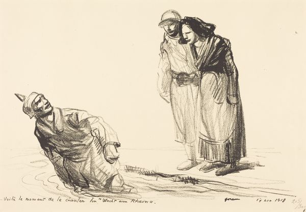 Théophile-Alexandre Steinlen rendered this lithograph, Serbian Cavalry, First Episode, in 1916. Immediately, our eyes are drawn to the veiled figures, emblems of sorrow and endurance. These women, cloaked in shawls that conceal as much as they reveal, are potent symbols of mourning. Consider the archetype of the Mater Dolorosa, the sorrowful mother, found across centuries and cultures. Here, the woman's head covering echoes this ancient motif. Her presence resonates with the emotional weight of countless mothers who have witnessed the ravages of war. Such gestures and compositions are not merely artistic choices; they are powerful visual carriers of collective memory. They tap into a deep, subconscious understanding of human suffering, allowing viewers to connect on a visceral, emotional level. These motifs are not static; they evolve, resurface, and take on new meanings, yet the underlying emotional resonance persists.