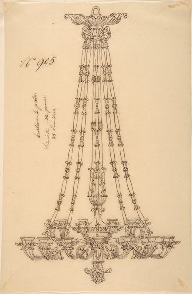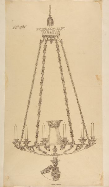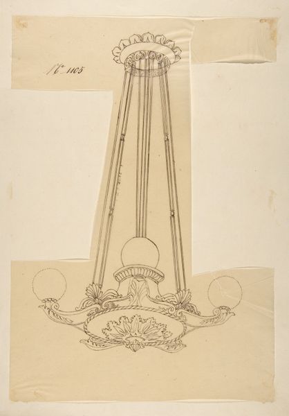 Curator: Here we have "Four Designs for Hanging Light Fixtures," an anonymous 19th-century work, blending etching, pencil, and printmaking on paper. My first impression is one of delicacy, of restrained elegance. Editor: Delicacy, yes, but also of constraint, perhaps reflecting the era’s rigid social structures. Lighting wasn’t merely functional, it was performative. These fixtures illuminated spaces that, then as now, often privileged certain bodies and activities while casting others into shadow, both literally and figuratively. Curator: I'm struck by the symmetry, the clear lines. Notice the balanced arrangements on either side of the central supports. Each design exhibits subtle variations in ornamentation, showcasing a mastery of neoclassical form and balance. Semiotically, one could read them as exercises in refined geometry. Editor: I agree, the visual order is compelling, however, order, especially of the Neoclassical kind, was wielded to bolster very specific notions of propriety and taste, which also implied exclusion, didn't it? Consider the wealthy homes these designs would have been made for. What class of people got to literally inhabit the "light?" Curator: I concede to your point; nevertheless, focus on the composition itself, the precision of the etching and the meticulous detail achieved by the artist using limited tools. It is very much about the inherent properties of line and form and not particularly indicative of any explicit narrative agenda, is it? Editor: The absence of an overt "agenda," as you say, doesn’t mean it wasn't inherently a tool to reinforce prevailing norms. Whose gaze were these designs meant to please? It’s about access to illumination, both in the domestic and societal sphere. Whose narratives are deemed worthy of light? Curator: Ultimately, regardless of that, the draftsmanship is still remarkably skilled, creating harmony through repeating elements. Each variation displays thoughtful application of ornamentation within a pre-established classical structure. It truly represents the spirit of refined craftsmanship. Editor: Agreed. It makes us think critically, doesn't it? Both about the material skill in representing a "light," and who benefits, culturally and politically, when "light" is provided or withheld.