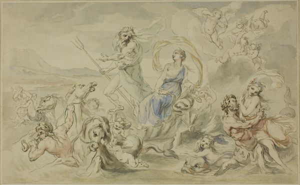 Editor: This is "Christ and the Virgin in Glory," a drawing by Giacinto Brandi. It’s difficult to date exactly, but it's executed in chalk on toned paper. I find the image really beautiful, soft even. It feels very heavenly. What do you see in this piece, beyond the obvious? Curator: I see echoes of earlier traditions, for instance, the symbolic weight carried by halos—circles of light—that signified divine status. Have you noticed the halos are barely suggested, simply circles of dashes. Editor: Right, I see them! I wonder why the artist has left them more subtle? Curator: Exactly! Think about what those faint outlines *suggest* about evolving beliefs, where the emphatic declaration of holiness gives way to more internalised spirituality. Brandi uses this traditional language, yet subtly changes it. Look at the gestures, the posture of the figures. Christ isn’t reigning down on the Earth but is seemingly suspended in heavenly grace, suggesting a sense of dynamic interplay between earthly suffering and divine reward. This creates more emotional resonance, right? Editor: Yes, definitely. There is this sense of invitation, too! Like you're being welcomed into this holy scene, rather than just observing it from afar. Curator: Precisely! Now consider, too, the expressions and gaze directions—where do they lead your eyes, and consequently, your thoughts? Editor: I'm following them as they weave through the whole image. It encourages you to contemplate your relationship to faith in its complexity. It is truly intriguing how artists reworked visual language! Curator: And that’s precisely where the power lies: in revealing our cultural memory through visual symbols that transcend mere depiction.