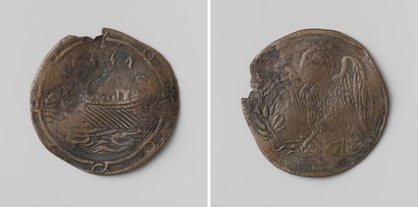 Editor: Right, next up we have “Overtocht van Karel V naar Spanje,” or "The Crossing of Charles V to Spain," created anonymously in 1556. It's a small, circular metal relief, currently housed in the Rijksmuseum. My first impression is how detailed it is, considering the scale; I find it really draws you in. What story does it tell, in your view? Curator: This little disc… ah, it's more than metal; it's a pocket-sized drama! To me, it whispers tales of endings and new beginnings. Charles V, a powerful ruler, abdicating and setting sail for a monastery in Spain… There's such profound humanity in that, don’t you think? Editor: Definitely, it’s poignant! I hadn’t thought about it that way, picturing it only as a historical record. Curator: But isn’t history *always* personal? Look at the waves, how they crash—a metaphor, perhaps, for the turmoil of leaving behind an empire. Then consider the eagle on the reverse, surrounded by laurel...strength giving way to peace? Or power disguised. Is there something subversive at play, would you imagine? Editor: The composition really lends itself to multiple interpretations! And it’s kind of exciting that we might never know what the maker really intended. Curator: Exactly! The joy is in the wondering, in letting it spark thoughts and feelings… It’s a tiny thing holding enormous echoes. That’s magic. Editor: Absolutely! Thanks, I hadn’t considered all those different layers before. Curator: My pleasure! Now, who wants to contemplate the meaning of chipped edges? The mystery never ends!