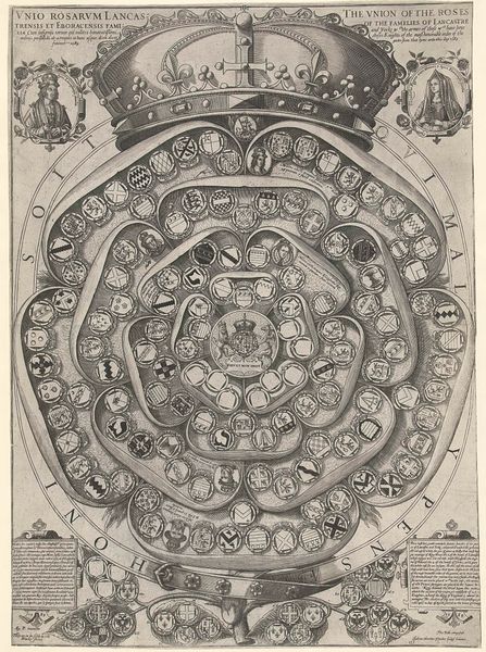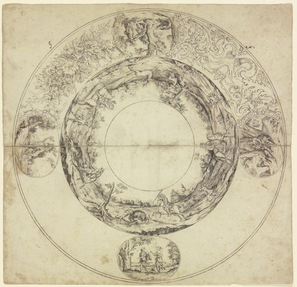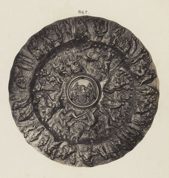 Editor: Here we have an "Ivoren pronkschotel," which translates to "Ivory ornamental plate," made between 1869 and 1887. It’s a print using metal, engraving, and relief techniques. It's packed with figures and scenes; I'm struck by its incredibly detailed composition. What jumps out at you? Curator: Immediately, I observe the complex layering of pictorial space. Note how the central medallion draws the eye, then guides it to the surrounding vignettes. Each scene, contained within its own oval frame, presents a microcosm of dramatic action. Consider the masterful deployment of line, how it defines form and articulates movement, contributing to a dynamic overall composition. Editor: So you are mostly focusing on how it's made, the techniques? I'm trying to understand the scenes! Curator: Precisely. One can appreciate the piece through the lens of technical prowess without needing to delve immediately into narrative. Do you notice the strategic placement of light and shadow? The engraver uses chiaroscuro to sculpt forms, lending depth and volume to the otherwise flat surface. Observe the lines - their thickness, direction, and density create patterns, guiding the viewer's gaze through the composition. Editor: Okay, I see that now. The light really does pop out specific actions in the different oval frames. So you are saying we can understand it as an object of lines and patterns. Curator: Indeed. By examining the formal relationships between these elements, we come closer to grasping the essence of this work as a testament to artistic skill. One can focus on the craftsmanship, the skill, how that comes through, regardless of any story the object is depicting. It is all about decoding the structure of artistic achievement itself. Editor: That’s a helpful way to approach this plate, thank you! I realize now how much information can be gathered simply by looking at technique. Curator: My pleasure. The structural aspects are so rewarding.