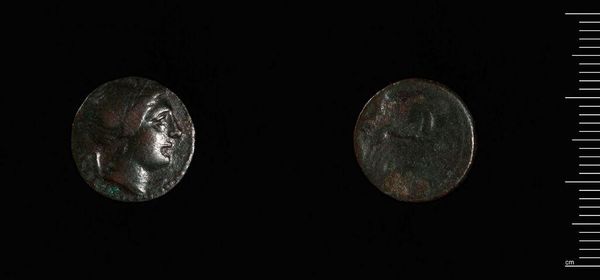 Editor: Here we have a coin, possibly from the reign of Orodes I of Parthia. It's a humble little artifact, but what stories do you think it holds? Curator: Coins were powerful symbols. The ruler's image on one side projects authority and identity. What do you think the animal represents on the other side? Editor: Possibly a sign of the Zodiac, or maybe a royal emblem? Curator: Precisely. These images weren't just decoration; they were deliberate messaging, reinforcing the ruler’s power and connecting him to cultural narratives. Editor: So much meaning packed into something so small. I never thought about coins this way. Curator: Consider how they circulated – each exchange was a mini-proclamation of power, a constant reminder of the ruler’s presence. A fascinating glimpse into the past, isn't it?